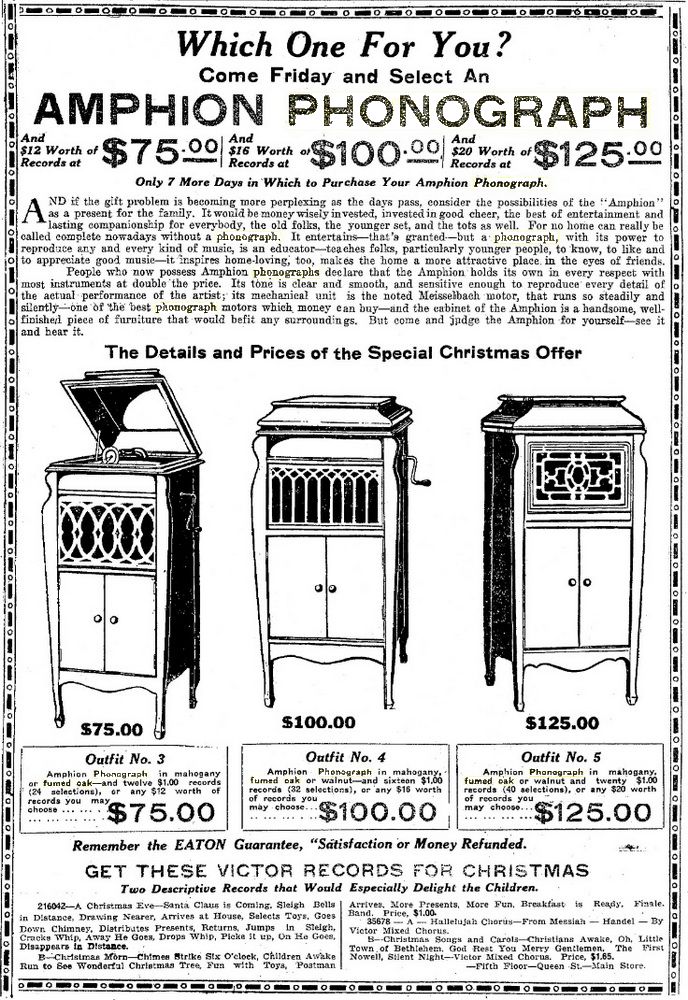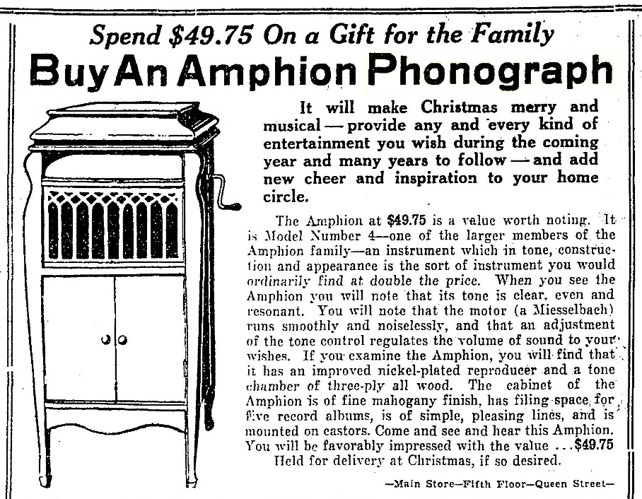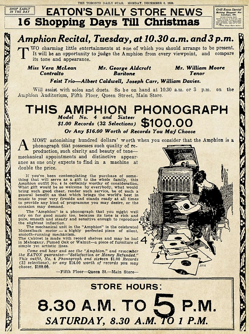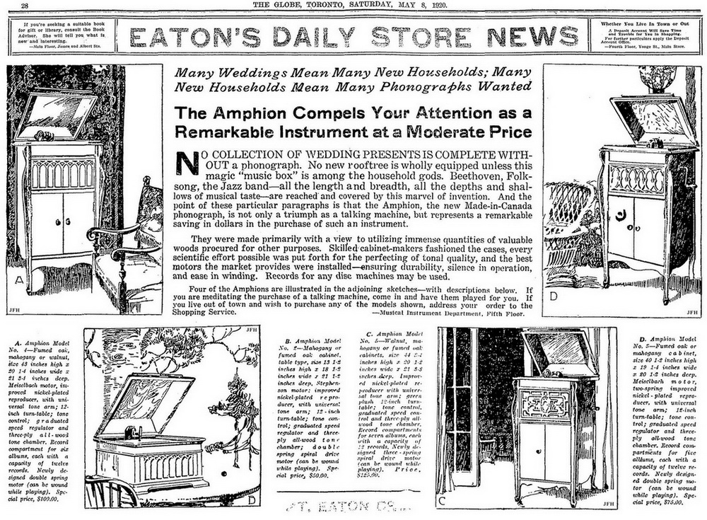 The Globe. May 8, 1920, p. 28. "... the new Made-in-Canada phonograph ..." Image digitally enhanced by Hopkin Design.