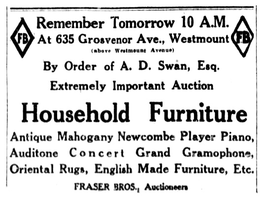 Montreal Star. June 9, 1925, p. 20. A household furniture sale including an Auditone Concert Grand Gramophone.