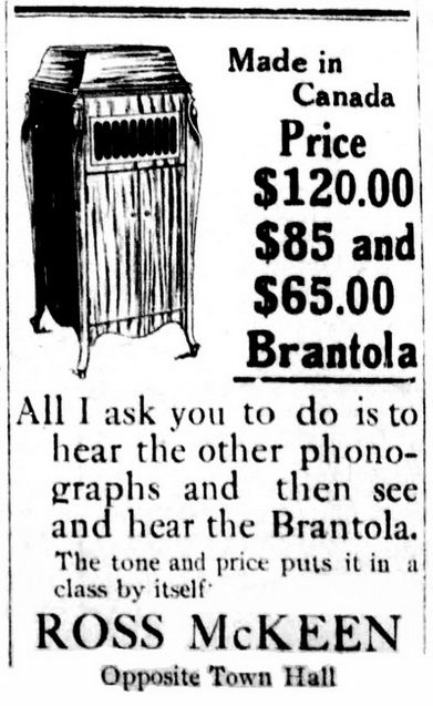 From: https://www.huroncitizen.ca/the-schools-of-morris-township MORRIS ONE-ROOM SCHOOLS Tuesday, 10 May 2011 11:09 THE SCHOOLS OF MORRIS TOWNSHIP Reprinted from The Brussels Post - 1981 S.S No. 1 – Wallace’s School Wallace’s School or the S.S. No. 1 in Morris Township has been used for everything from a schoolhouse to a pig barn. With information obtained from Mrs. Harold Laffin, Mrs. Bill Souch and Mr. and Mrs. Aubrey McNichol, some of the school’s history is recorded here. Built in 1892, replacing an original log structure from 1876, it was purchased by Keith Richmond and then it was sold to Bill Souch. When Mr. Souch’s barn burned down he needed a place to put his pigs so he put them downstairs in the schoolhouse and the grain upstairs. A church known as Ebenezer Methodist Church once stood across the road from the school. When Mr. McNichol went to the school somewhere between the years 1936-1938 the attendance was at one point down to six boys and one girl. [snip] In 1920, it was the first school in the area to have bought a Brantola phonograph to teach the children the value of music. In the same year, the woodshed was moved to the rear of the school and put up on concrete. Brant-ola packing crate poster found in an antique store near Toronto in 2018.