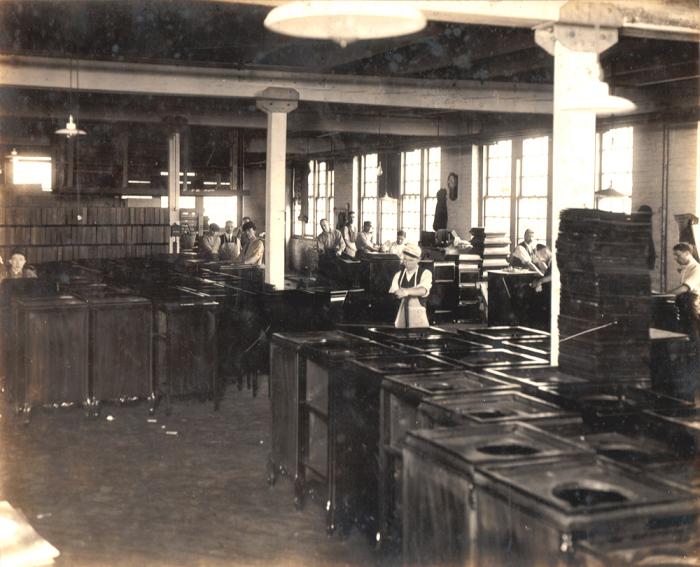 Photo (Collection of Bill & Betty Pratt) shows the interior of what we expect to be the Brunswick factory. This supposition is based on the cabinets which have the legs and carving similar to the Ultona. The only other clues that it is definitely Canadian, are the boy's Magic Baking Powder cap, and the Pequegnat clock on the wall. The window arrangement also matches the present building seen from the south. Although new windows are minus the small window panes, we can see the arrangement of 4 sections on the south, and 3 on the east wall.