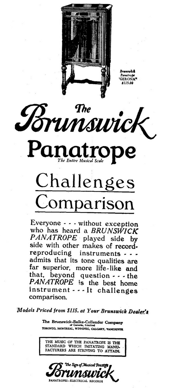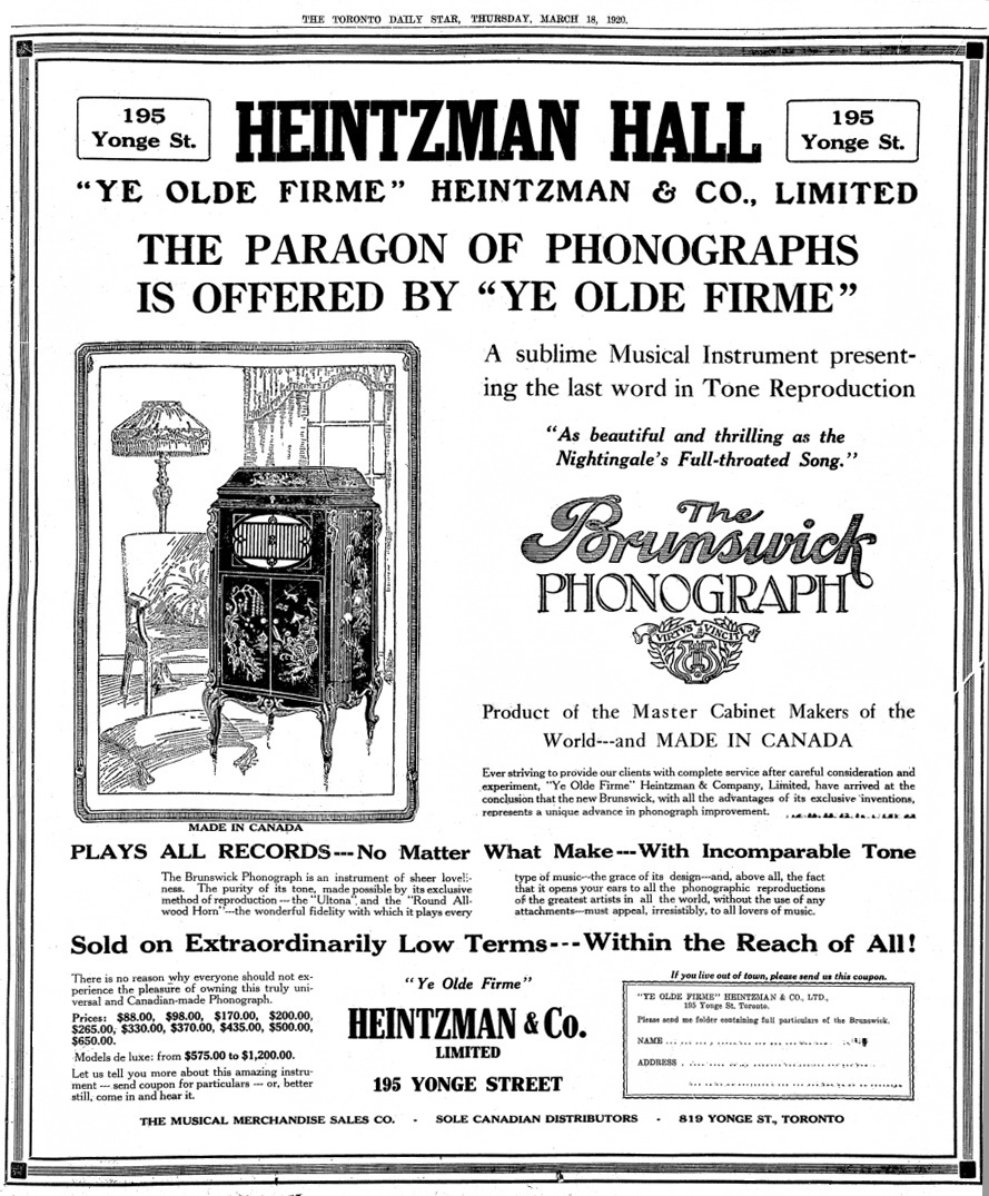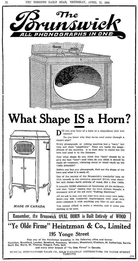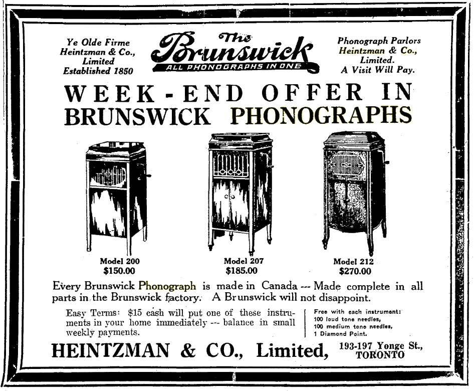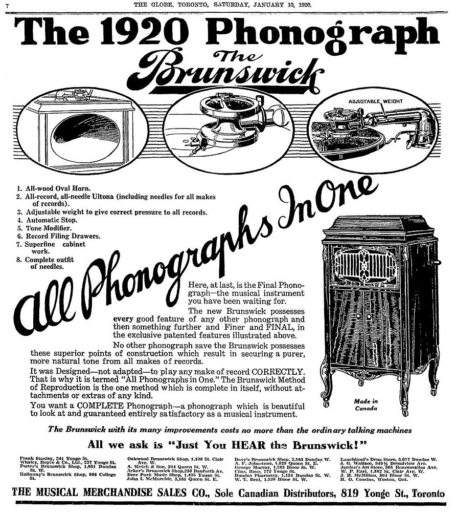 Toronto Daily Star, January 12, 1922, p. 7 - "Every Brunswick Phonograph is made in Canada."