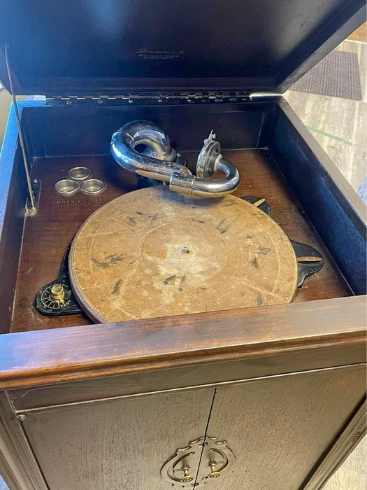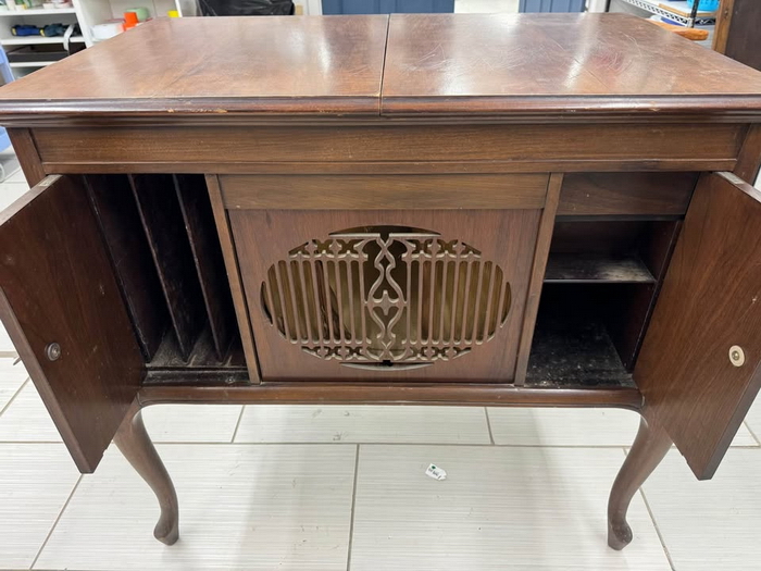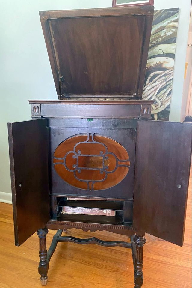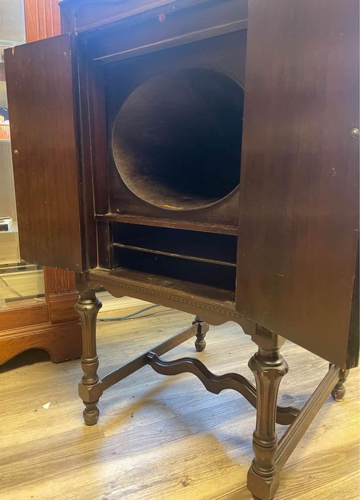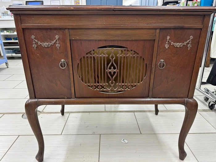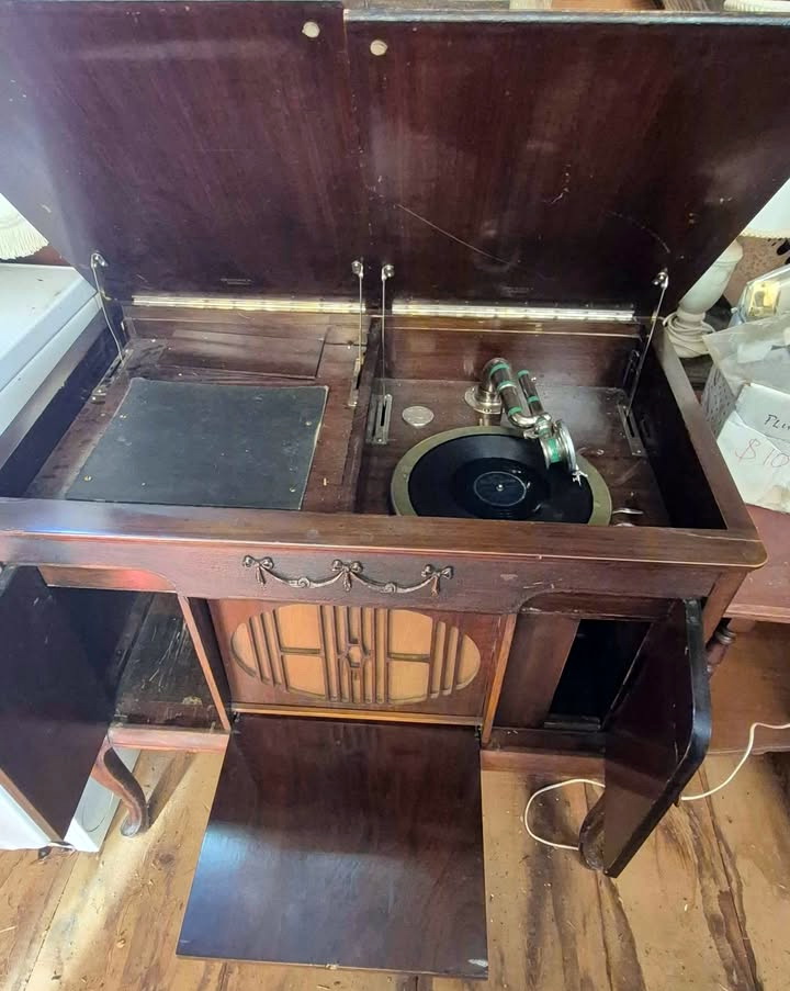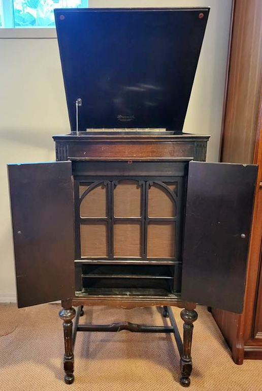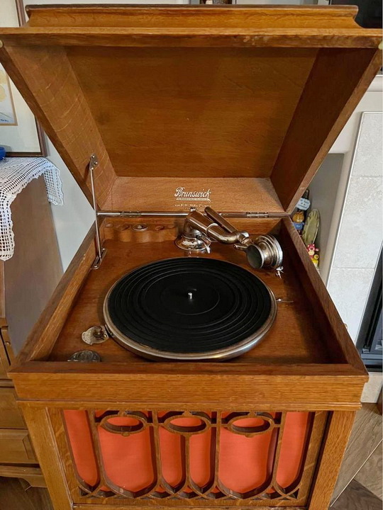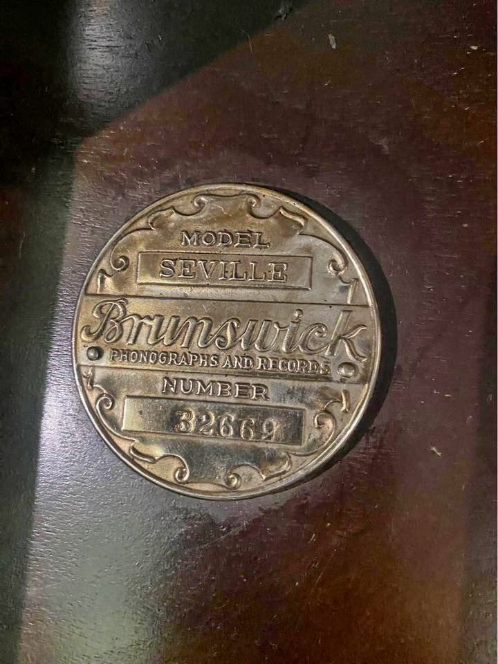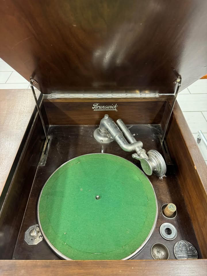 A console model Brunswick phonograph for sale in Cambridge, Ontario in 2024.