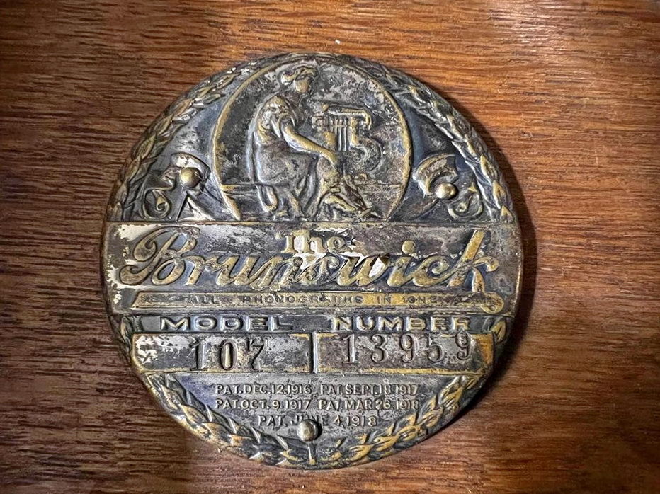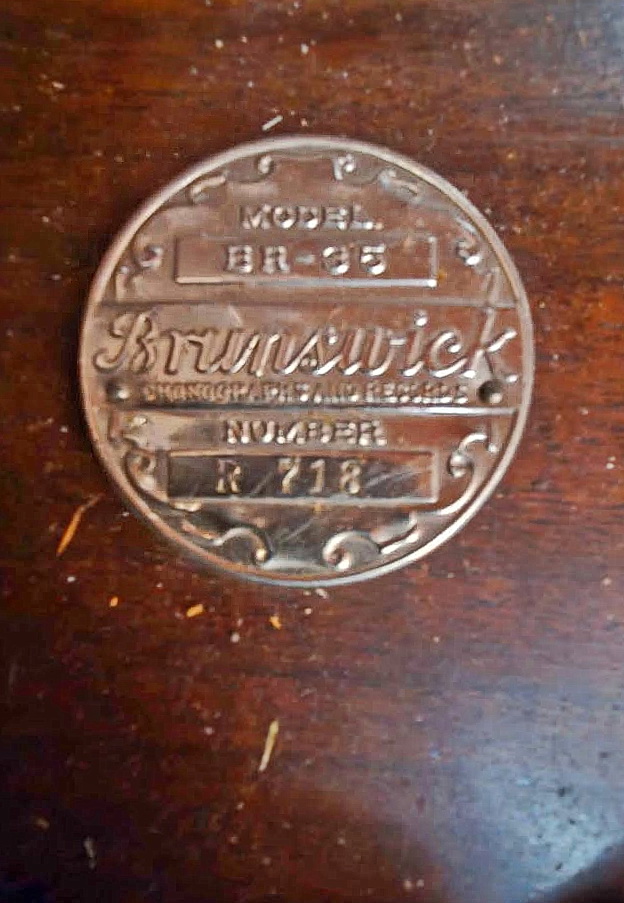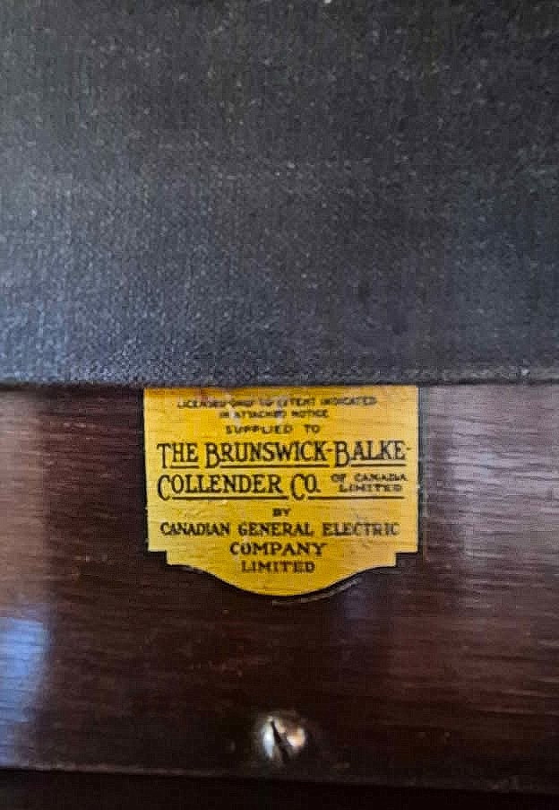 A console model Brunswick phonograph for sale in Central Kootenay, B.C. in 2025. The label shows the close connection between the Brunswick-Balke-Collender Co. of Canada Limited and the Canadian General Electric Company Limited with whom Brunswick collaborated in manufacturing its all-electric phonograph. Submitted by Lance Husoy.