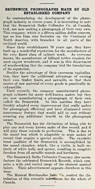 Toronto Daily Star, June 16, 1920, p. 19 - "Made in Canada and a Brunswick product entirely - one of the few Canadian-made phonographs which are built wholly by one factory organization."
