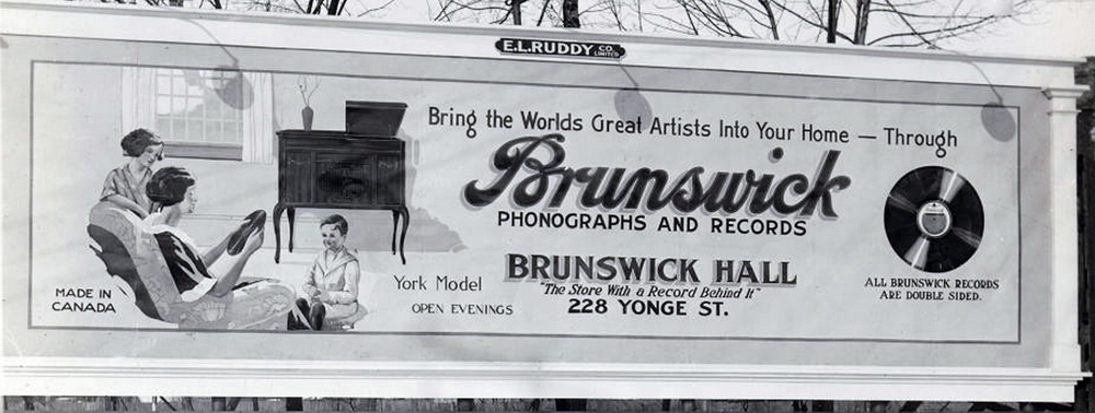 Talking Machine World, October 15, 1922, p. 150: "The Brunswick-Balke-Collender Co., this city [Toronto], where the Brunswick phonographs are made for the Canadian trade, has just completed the construction and delivery of a superb period model Brunswick phonograph for one of the palatial homes in Vancouver. This instrument was sold through the Kent Piano Co., of that city. Complete details of design and carving were forwarded to the Brunswick factory." Talking Machine World, December 15, 1924, p. 188: "Brunswick W. B. Puckett, president of Musical Merchanise Co., Ltd., has assumed the general management of the Brunswick-Balke Collender Co., of Canada, Ltd., with headquarters in this city. The latter organization is affiliated with the parent company, the Brunswick-Balke-Collender Co., of Chicago. Up to the present time the company manufactured for the Canadian maret at its factory on Hanna avenue, which plant was established in Canada in 1903, but its phonograph and record products were distributed by Musical Merchandise Co., Ltd., of which latter firm Mr. Puckett was president. The manufacturing end of the business remains unchanged but the distributing division is now to be amalgamated with the parent business and new office quarters and warerooms have been taken at 358 Bay Street, in which the stock and staff are now comfortably settled." Billboard for Brunswick Phonographs and Records at Brunswick Hall, 228 Yonge Street, Toronto. A York model phonograph is featured. Source: Toronto Public Library, Fonds 1488; E.L. Ruddy Company fonds.