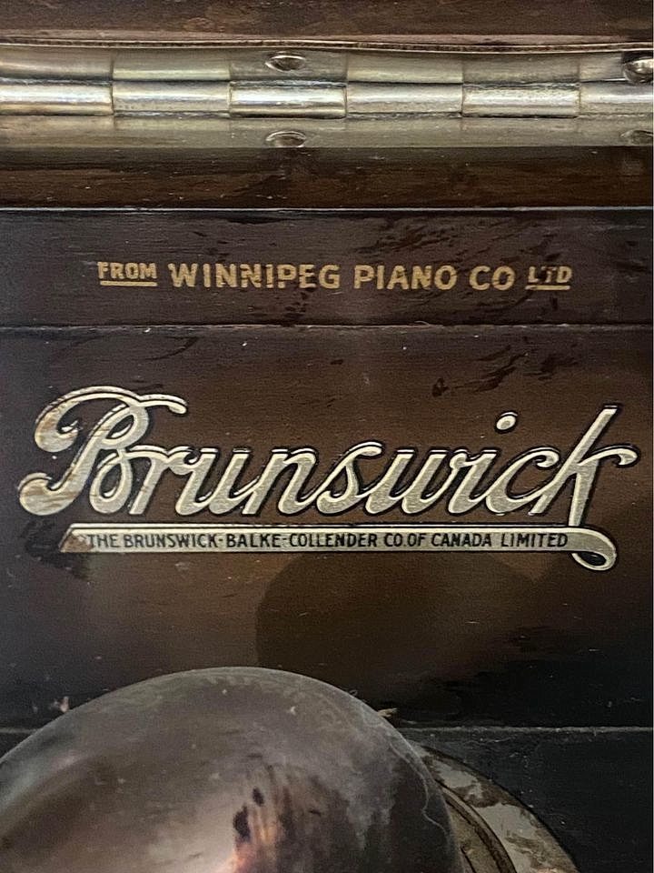 A Brunswick "Seville" model, sold by the Winnipeg Piano Co. Ltd., for sale in Winnipeg, Manitoba in 2024.