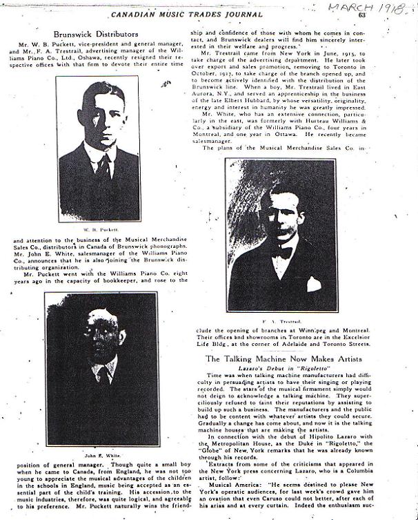 CMTJ, March 1918 - An announcement is made that Burdick (Burt) Trestrail, W.B. Puckett, and John E. White will establish the Musical Merchandise Sales Co. to distribute Brunswick phonographs in Canada. They are located in the Excelsior Life Bldg., at the corner of Adelaide and Toronto Streets (courtesy BP).