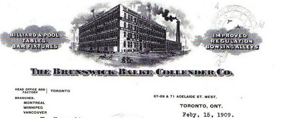 Betty Minaker-Pratt contributes the following: Arthur Zimmerman and I visited Archives of Ontario (AO), Companies Branch, Provincial Secretary where we found the first mention of Brunswick head office at 70 King St. west, licensed to operate in Ontario from the company in Cincinnati, Dec. 1906. Attached is the letterhead showing their start making billiard tables, bowling alley equipment, bar fixtures, Feb 15, 1909 (AO, Companies Branch, BP, AZ). [detail]