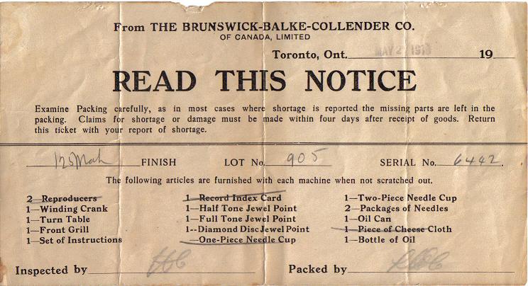 Original ephemera (collection of B. & B. Pratt) dated May 2, 1919, from The Brunswick Balke Collender Co. of Canada Ltd, Toronto. Read This Notice (contents of a packing case for a phonograph).