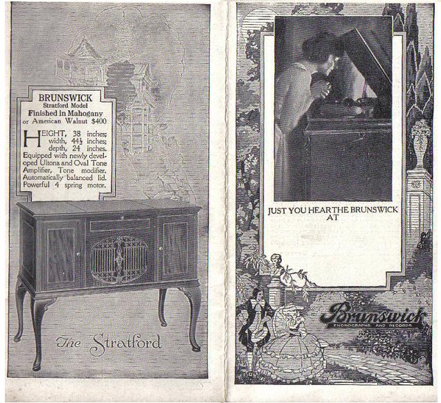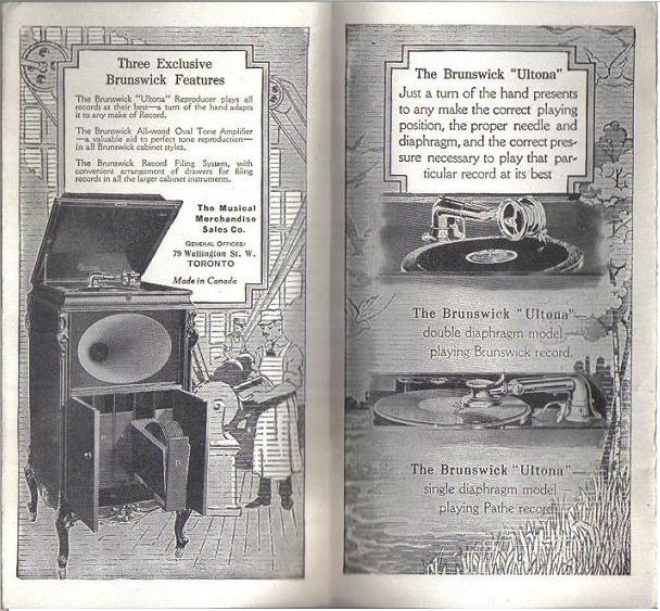 Another Brunswick pamphlet (collection of B. & B. Pratt), Ultona, and about 14 other models shown on 2 sides. Made in Canada, distributed by The Musical Merchandise Sales Co, Offices, 79 Wellington St. W. Toronto.