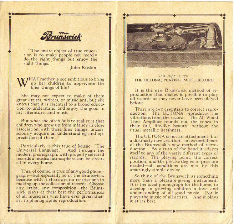 A Brunswick pamphlet (collection of Bill & Betty Pratt), Ultona, patented Sept. 18 1917, pp 1-2, Made in Canada.