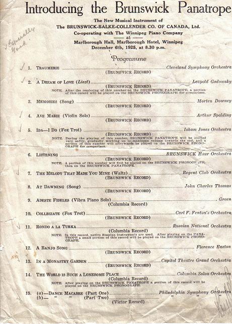 Original ephemera (collection of B. & B. Pratt), Dec. 6, 1925, Programme at Marlborough Hotel, Winnipeg, Introducing the Brunswick Panatrope. Musical programme listing Brunswick, Columbia, and Victor records.