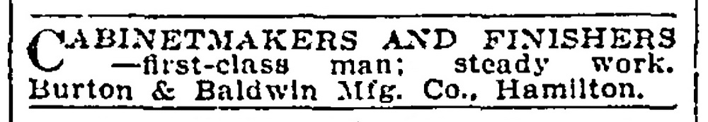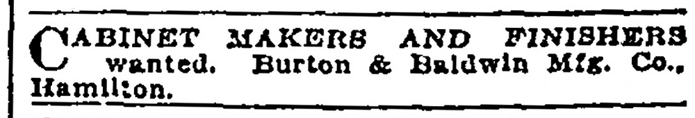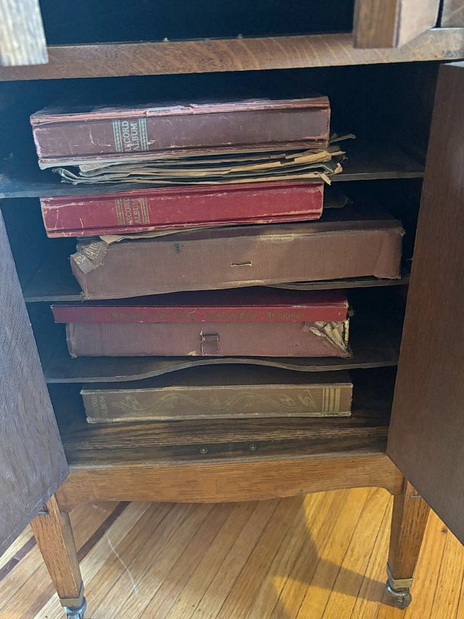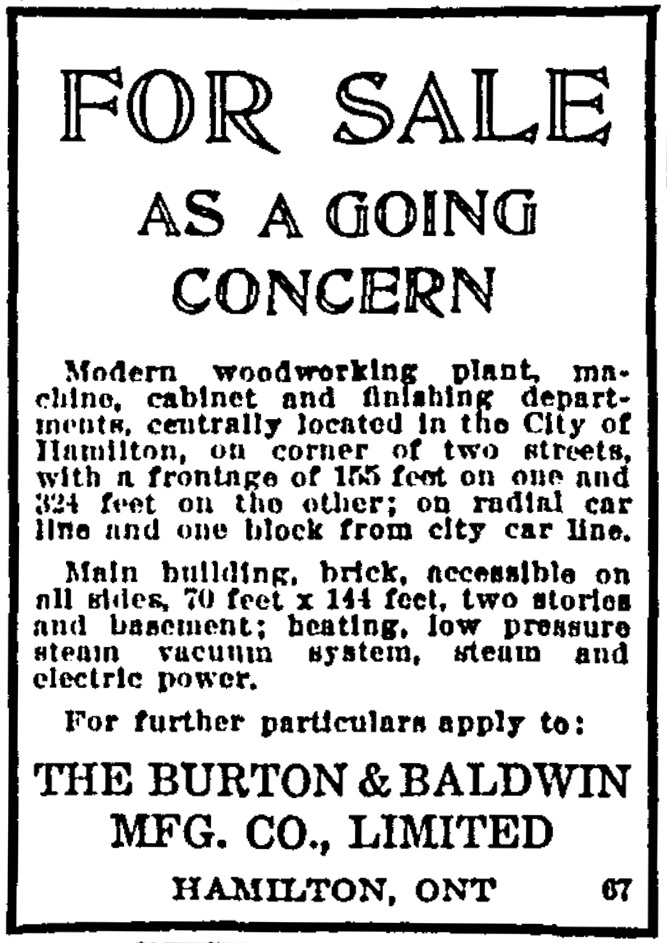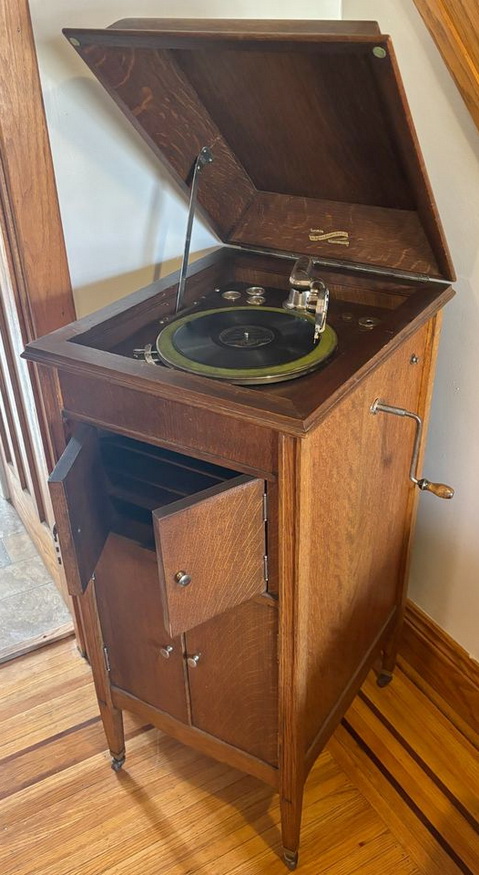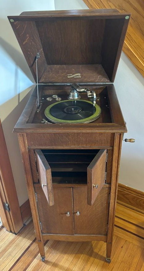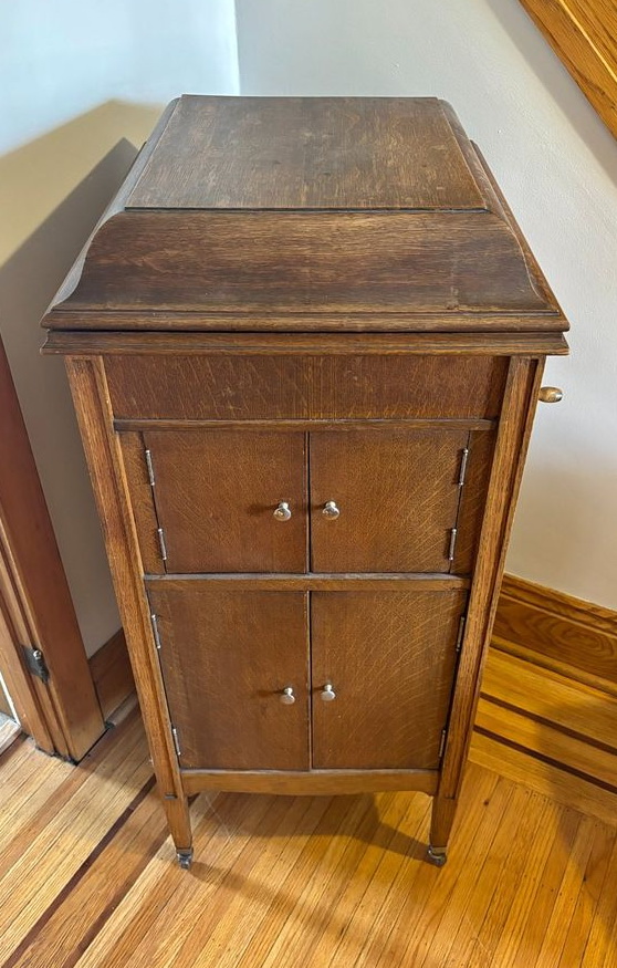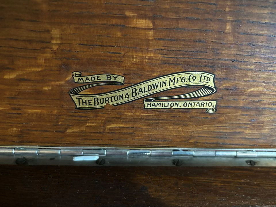 A Burton & Baldwin upright phonograph in oak listed in Hamilton, Ontario in 2024.
