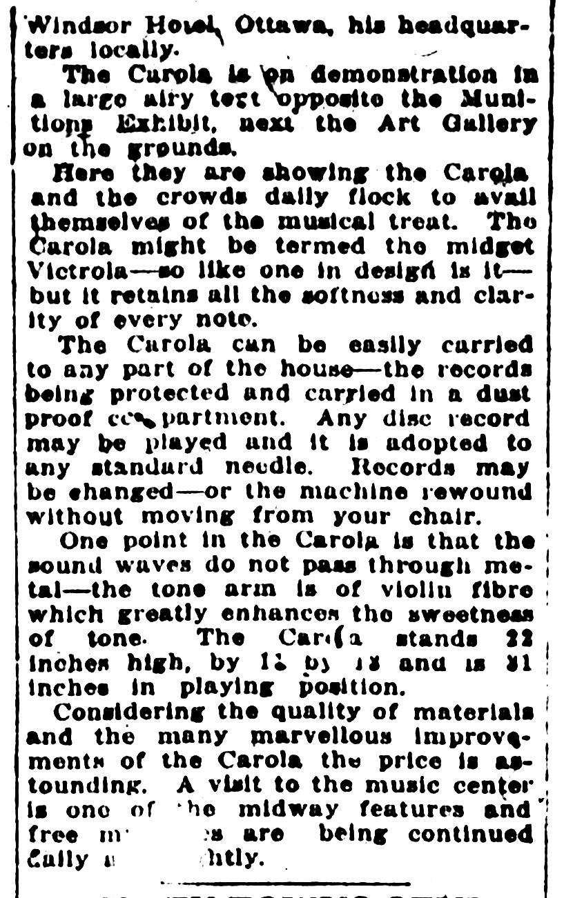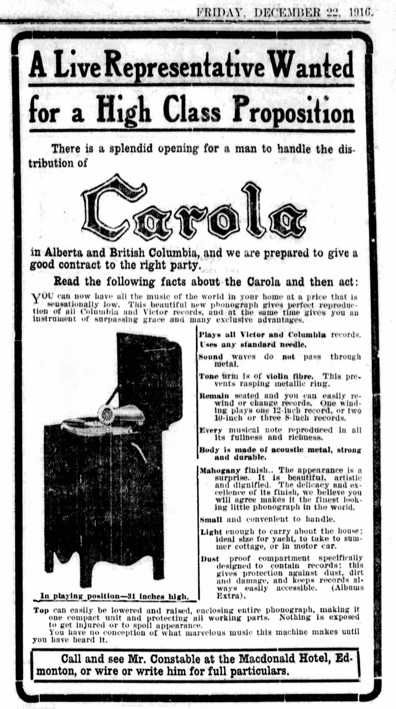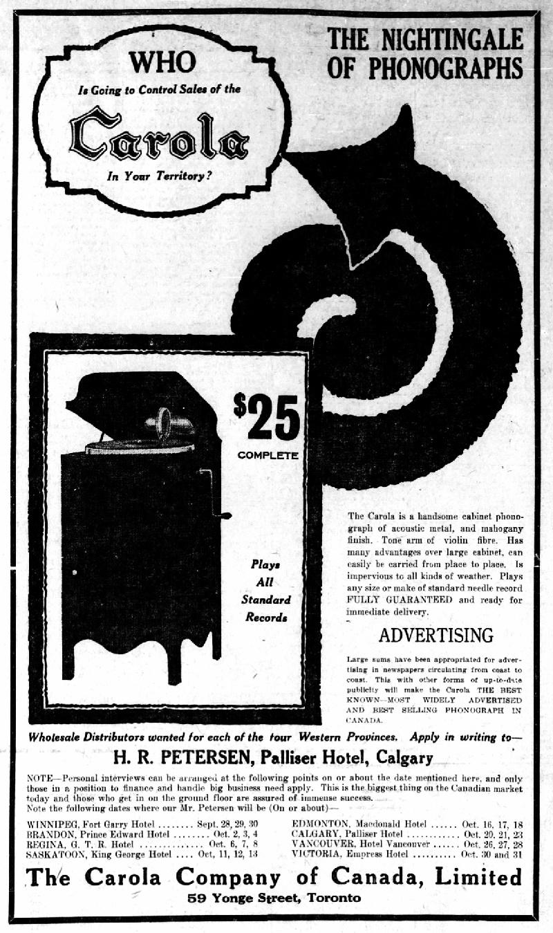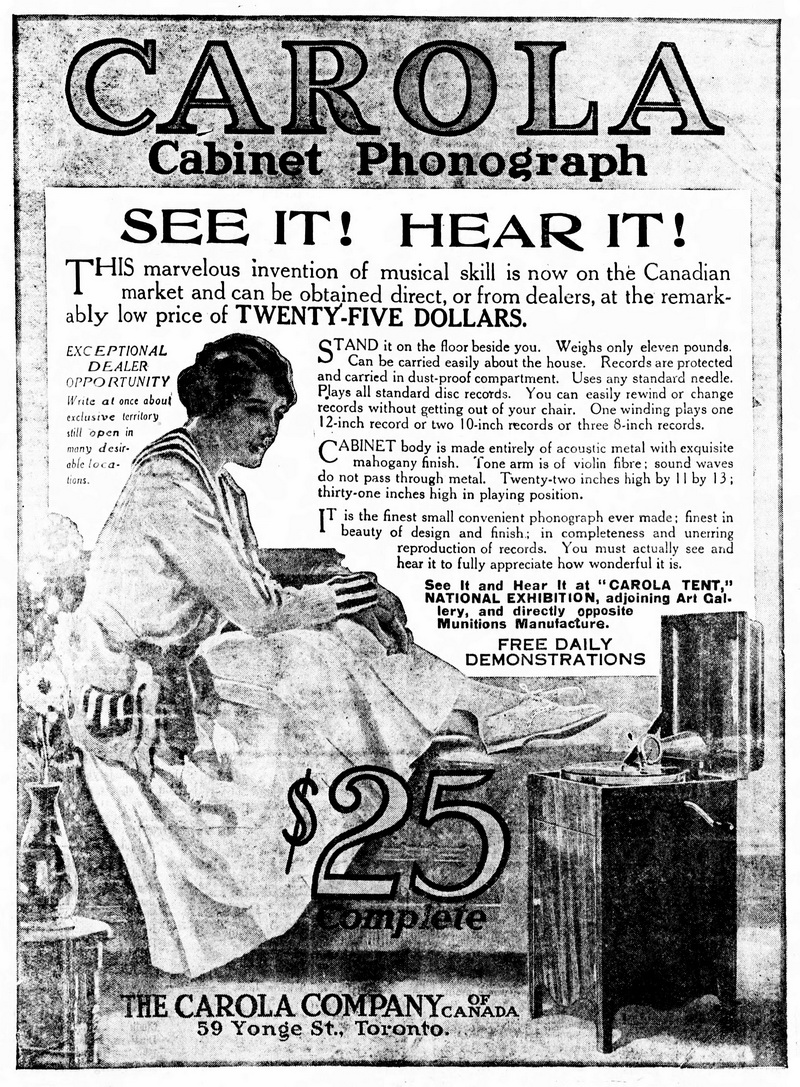The Carola Company of Cleveland, Ohio introduced a small metal talking machine in 1916 and advertised extensively through 1917. Although there is no definite evidence that the Carola was manufactured in Canada, the Carola Company of Canada Limited was incorporated in 1916 "to manufacture phonographs".