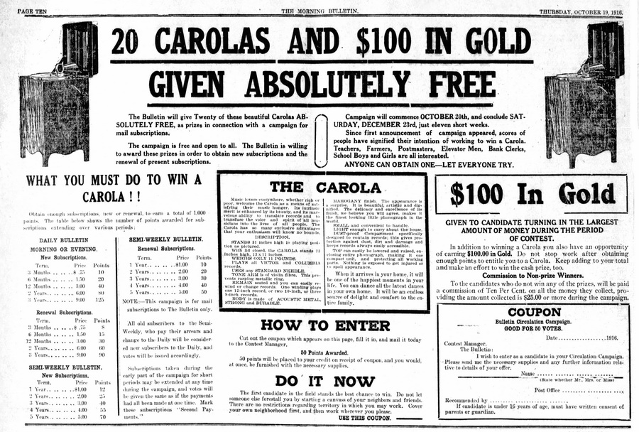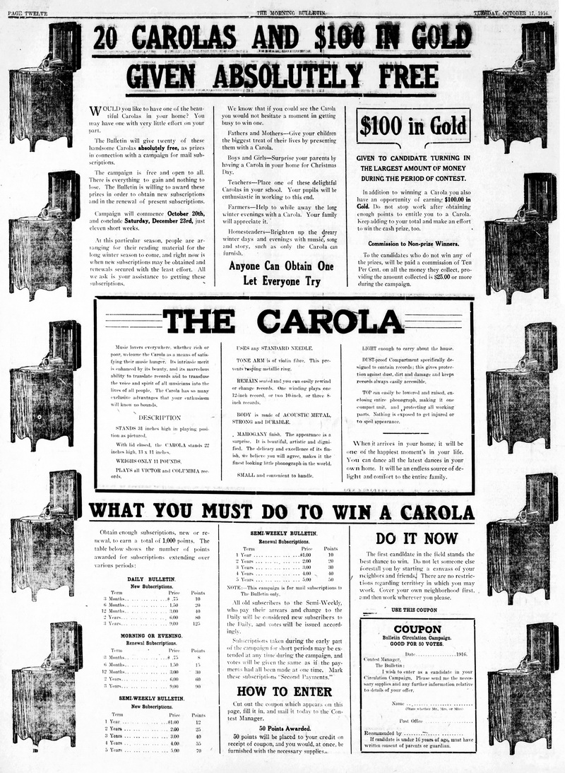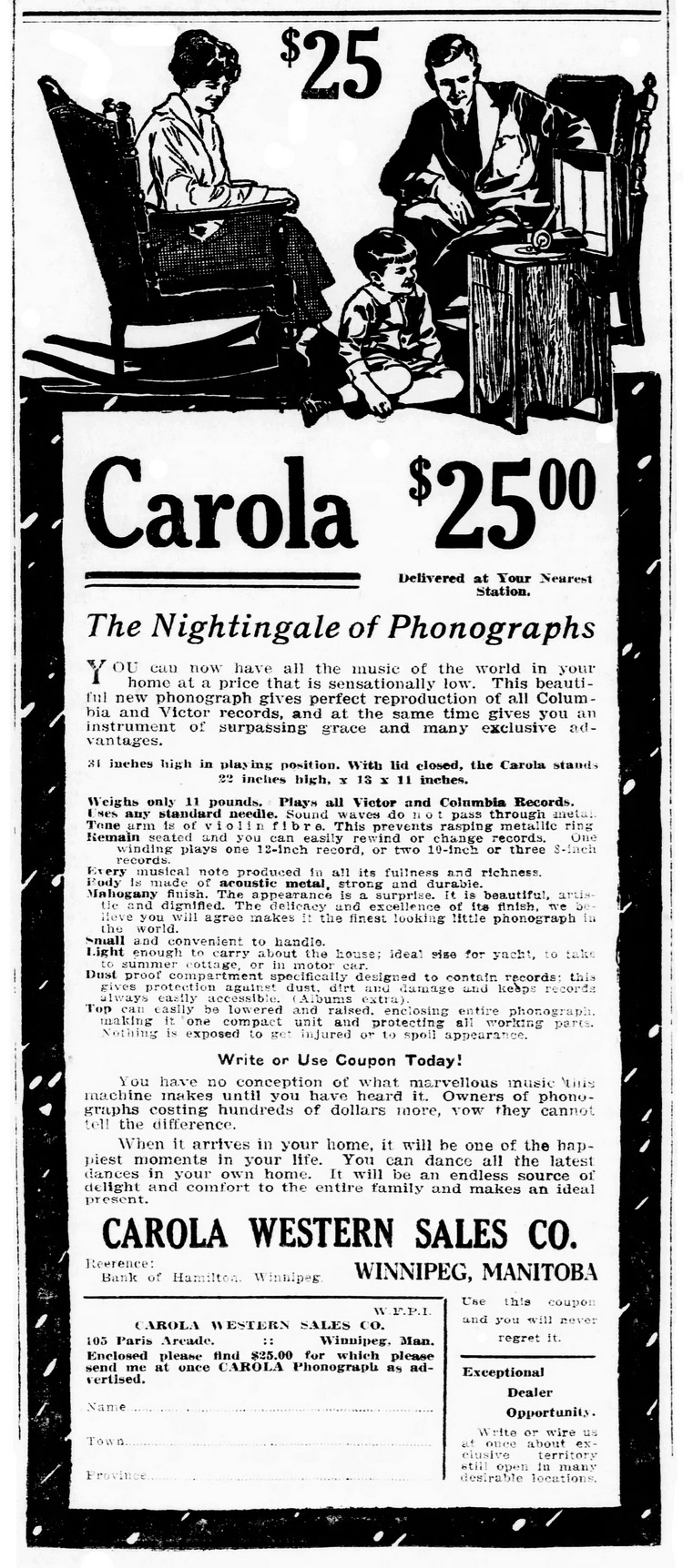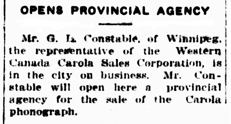Talking Machine World, May 1917, p. 42: "WINNIPEG, MAN., May 2. - The Dominion Sewing Machine Co., 80-82 Lombard Street, are exclusive sales agents for the Viola, a "made in Canada" product, and the Carola Western Sales Co., 15 Paris Arcade, are handling the Carola in the Western Province."