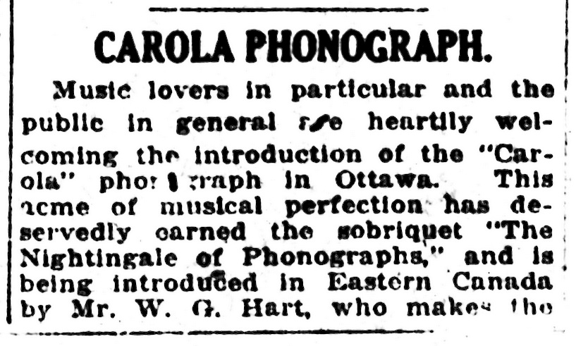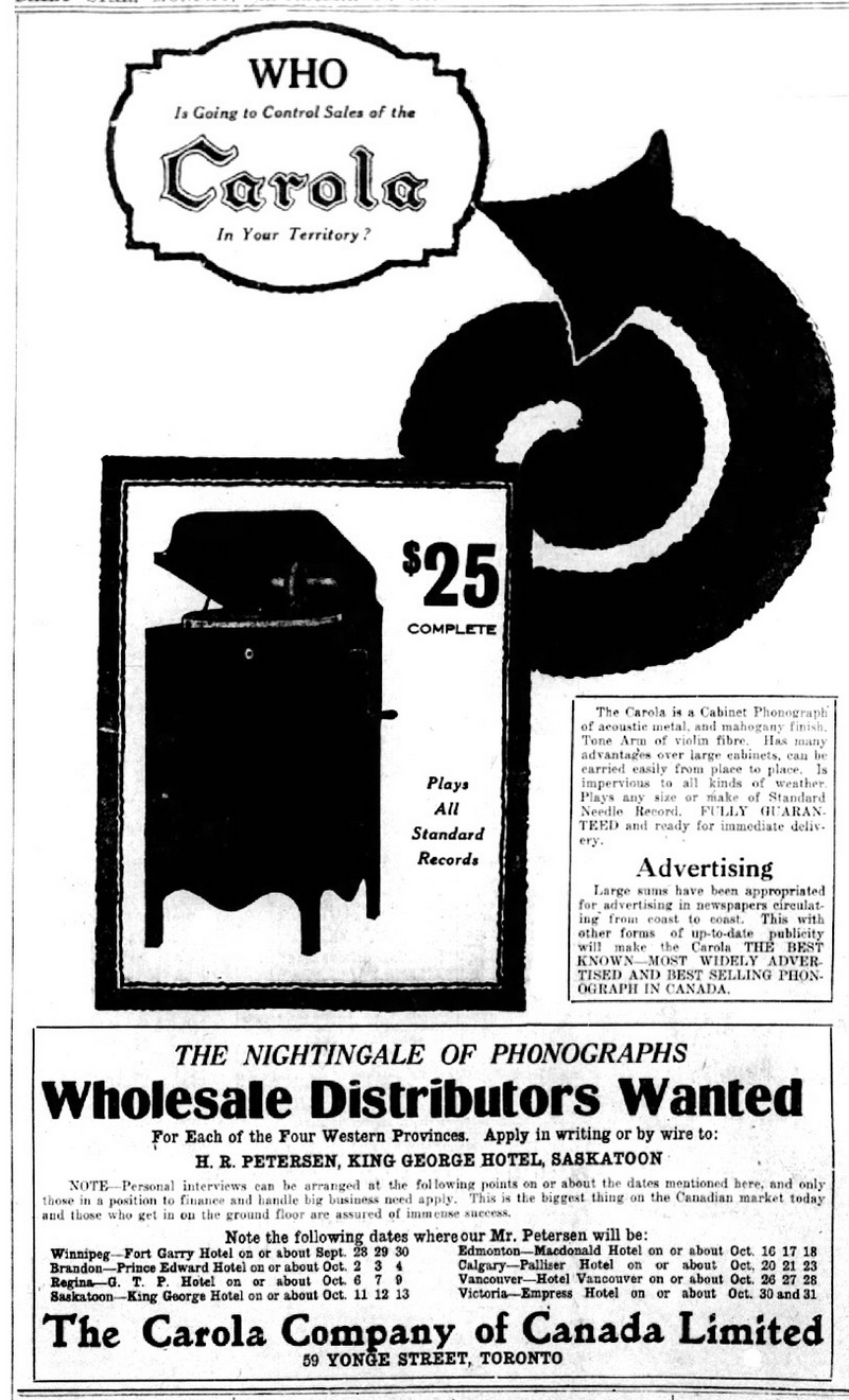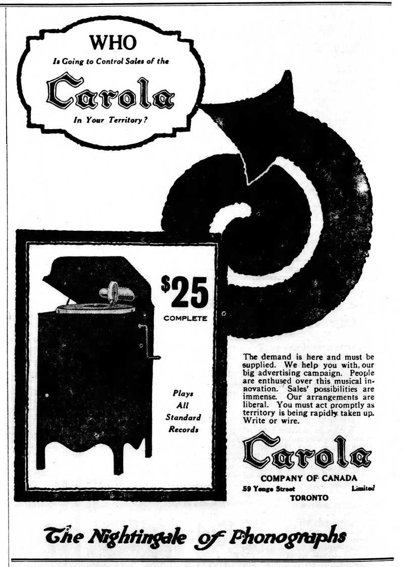 Talking Machine World, December 1916, p. 19: "The Carola Co., of Canada, Ltd., has been incorporated with a capital stock of $40,000 by Warren K. Cook, Herman R. Peterson and Frank J. Foley, all of Toronto, Ont., to manufacture phonographs, etc."