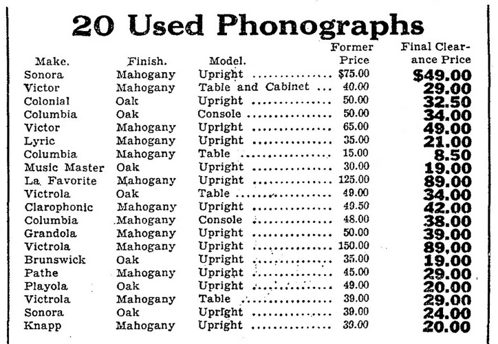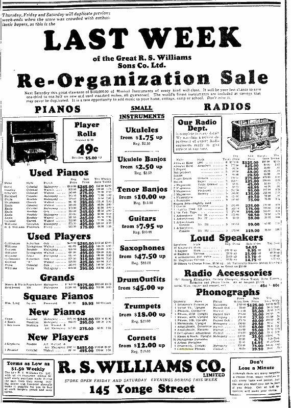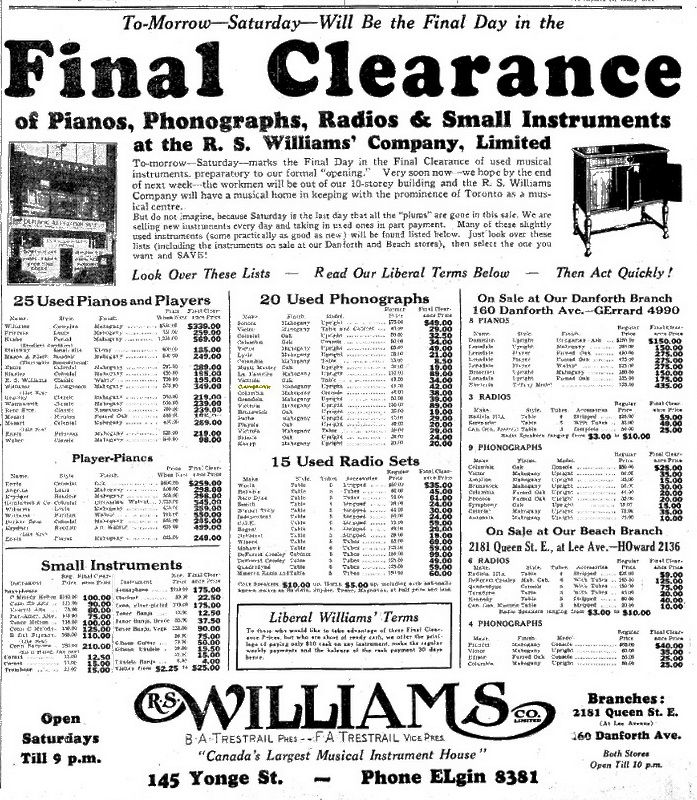 Toronto Daily Star, April 18, 1928, p. 4. An R.S. Williams Co. Limited ad including six used Clarophonic phonographs, and detail of ad.