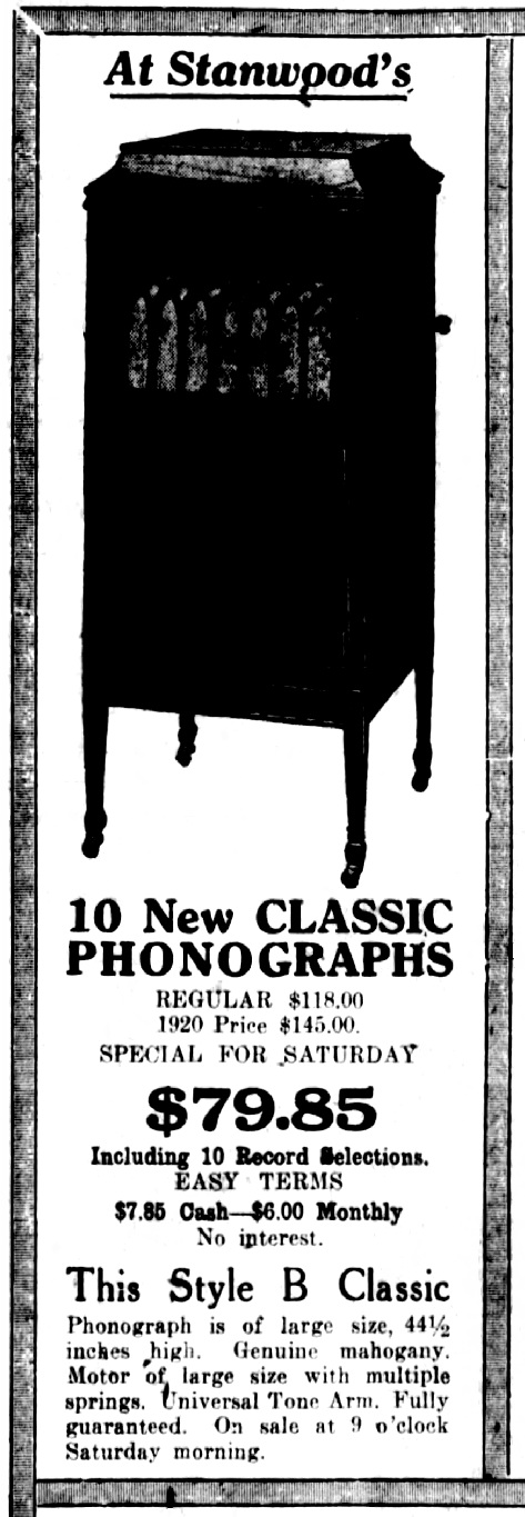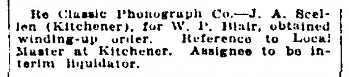 Exactly two years later on May 10, 1919, The Globe newspaper (Toronto) reported in its column "At Osgoode Hall" (courthouse) that the Classic Phonograph Company had obtained a winding-up order, "assignee to be interim liquidator". Classified ads in The Ottawa Citizen newspaper in March 1920 offered used Classic phonographs and in May 1921, Stanwood's Limited, Winnipeg, sold Classic phonographs in a manufacturer's clearance sale.