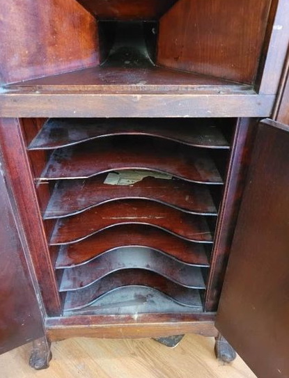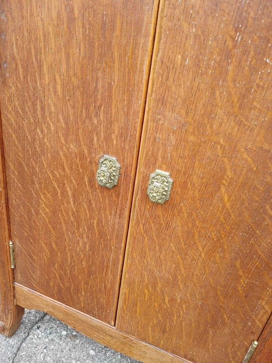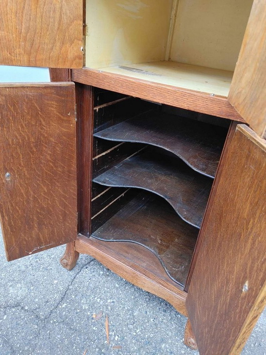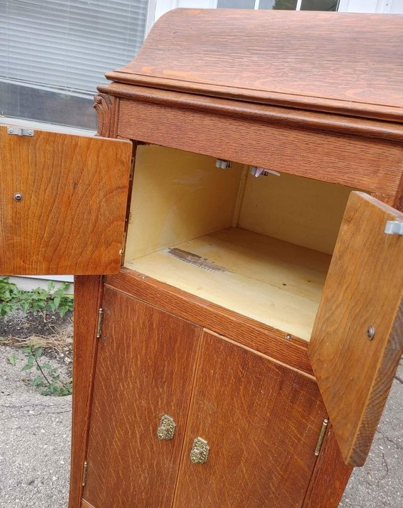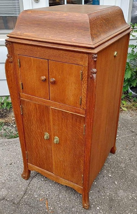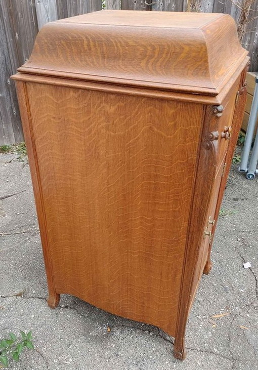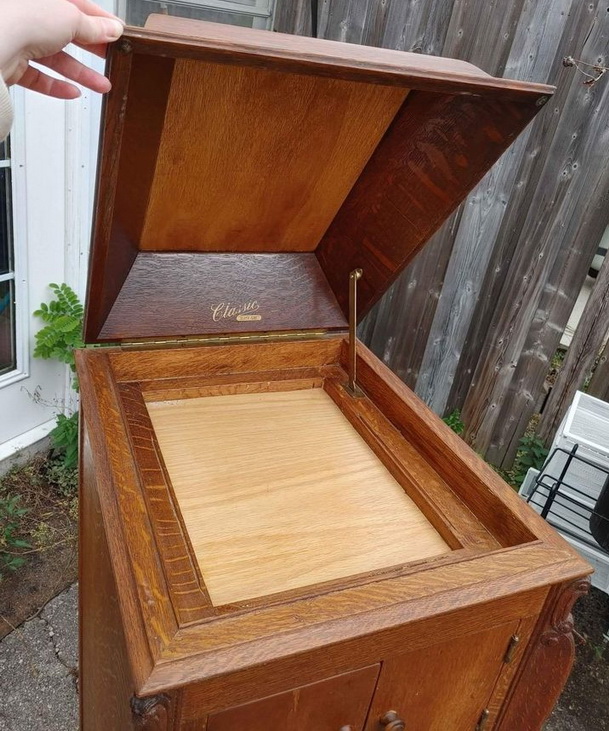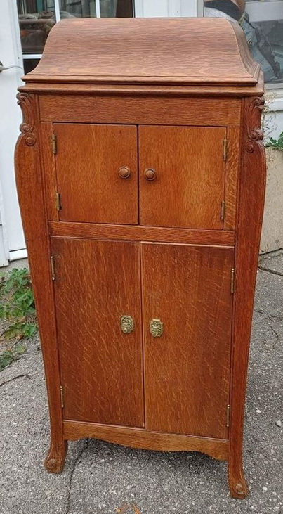 A Classic "Silver Tone" oak upright cabinet, without the mechanism, for sale on Facebook Marketplace in St. Thomas, Ontario in 2023.
