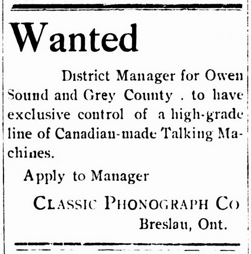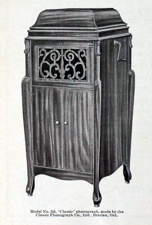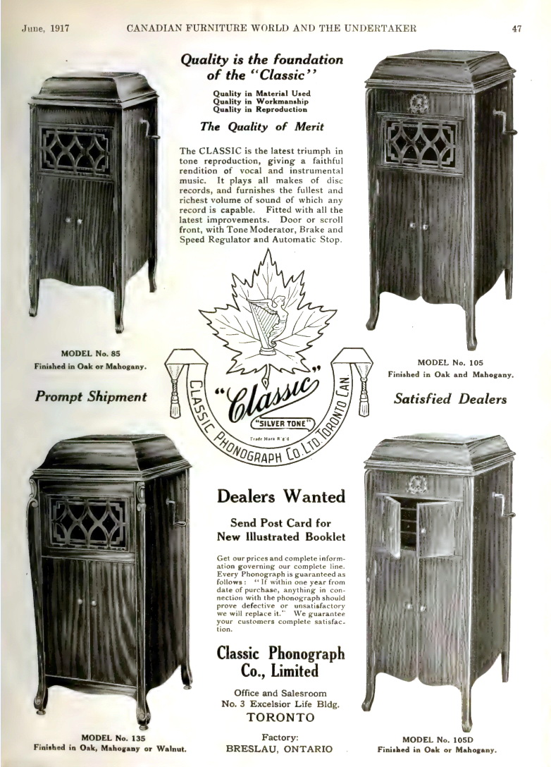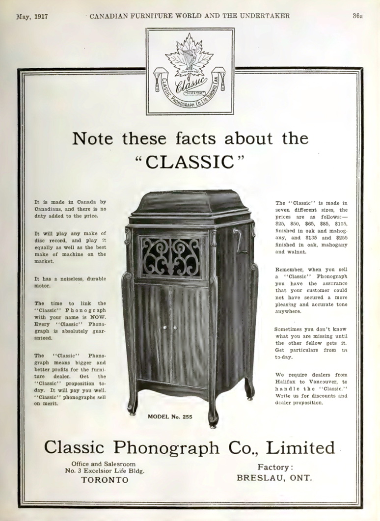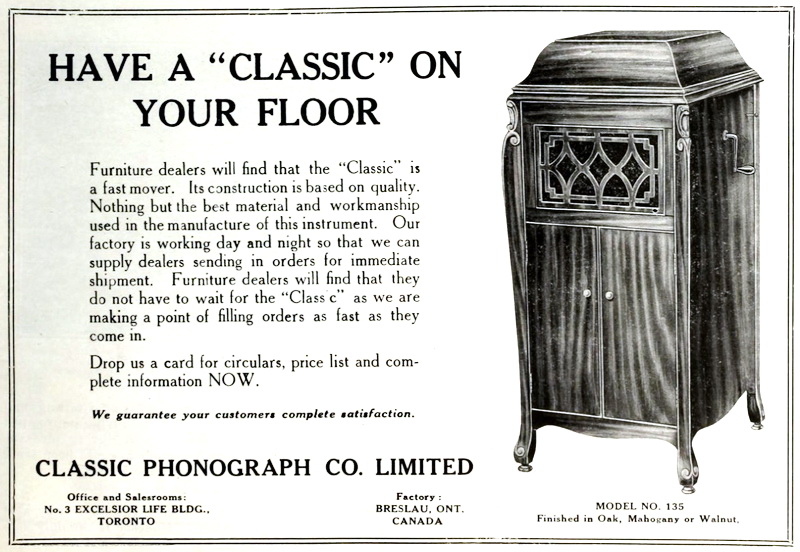 Canadian Furniture World and the Undertaker, May 1917, p. 36b: "CLASSIC" A CANADIAN MACHINE - The Classic Phonograph Co., Ltd., with factory at Breslau, Ont., and salesrooms in the Excelsior Life Building, Toronto, are putting out in the "Classic" a talking machine made in Canada by Canadians. It is built in seven styles in oak and mahogany, and in walnut in the higher grades. These styles range in price from $25 to $255, and all of the machines are guaranteed. The "Classic" has a pleasing and accurate tone, and will play any make of disc record. The motor is noiseless and durable.