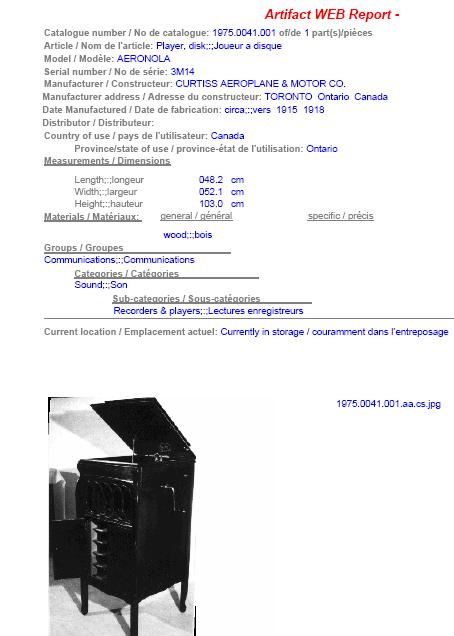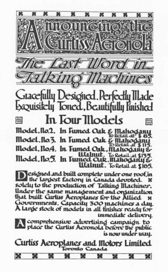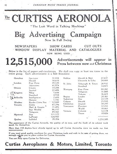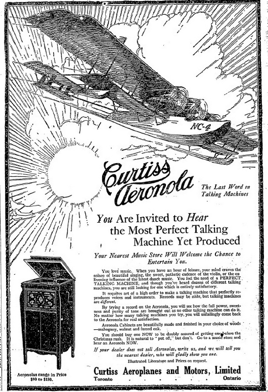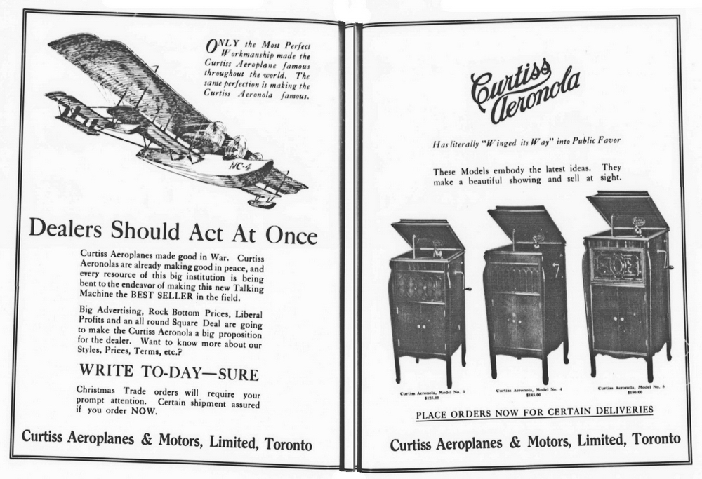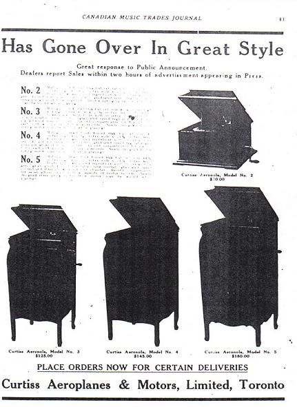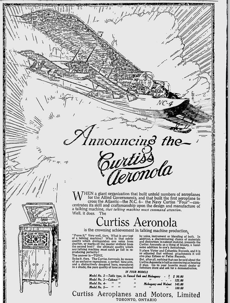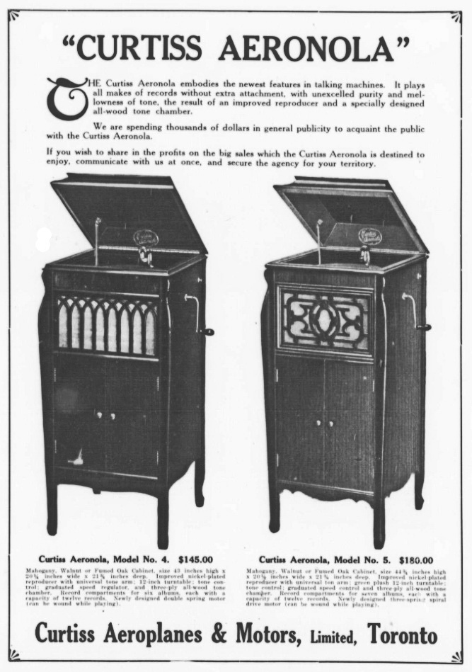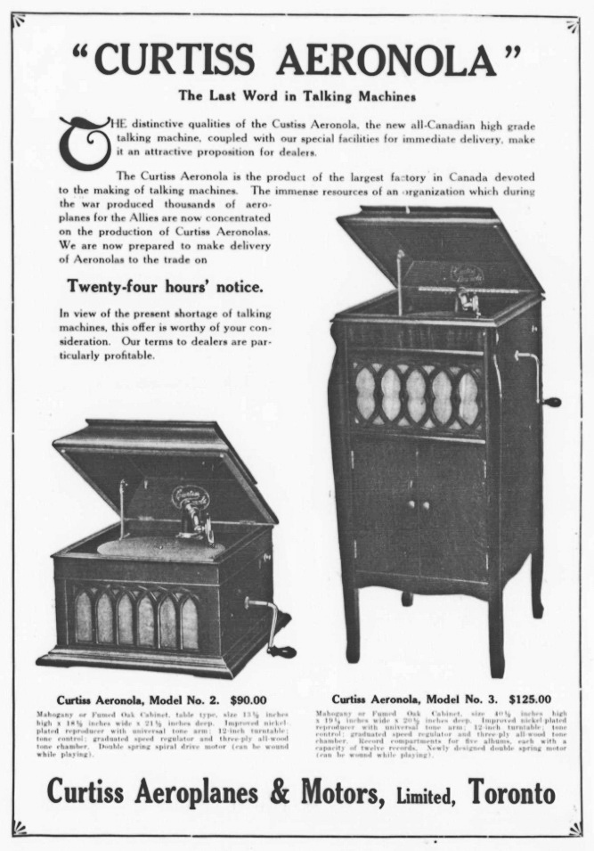 Canadian Furniture World and the Undertaker, October 1919, p. 44: "Curtis Aeroplanes and Motors, Ltd., are now making at their Toronto factory on Dufferin Street, a line of "Aeronola" phonographs."