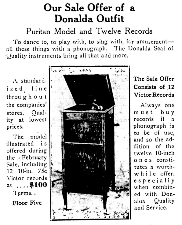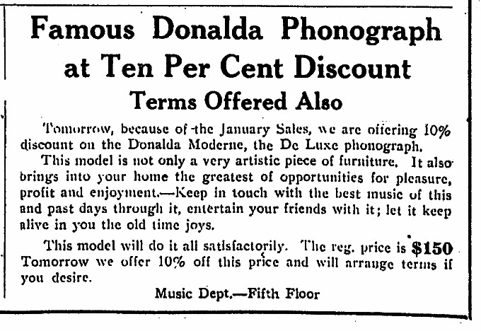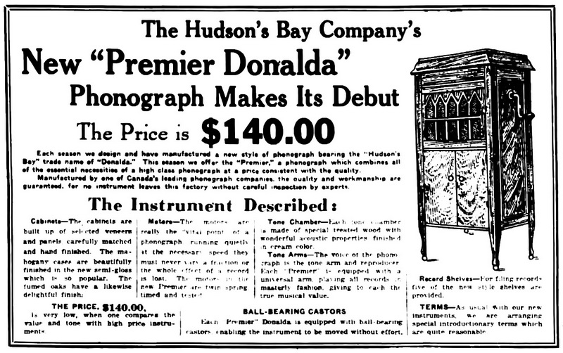 Donalda seems to be an in-house brand, made by one or more manufacturers, for the Hudson's Bay Company and sold out of their 'department' stores west of Ontario. A possible supplier, being local to Winnipeg, would be the Chopin Piano and Talking Machine Co. The Donalda surprisingly had a version with an electric motor. Like the European 'Melba' marque, they may be named after a notable, local (to Canada) opera singer, Pauline Donalda (b Lightstone). Ms. Donalda went to Paris and studied voice in 1902 on a grant from Donald A. Smith (Lord Strathcona) who at the time was Governor of the Hudson's Bay Company. She later went under a stage name honoring her benefactor. Info from Encyclopedia of Music in Canada. Picture courtesy wikipedia: