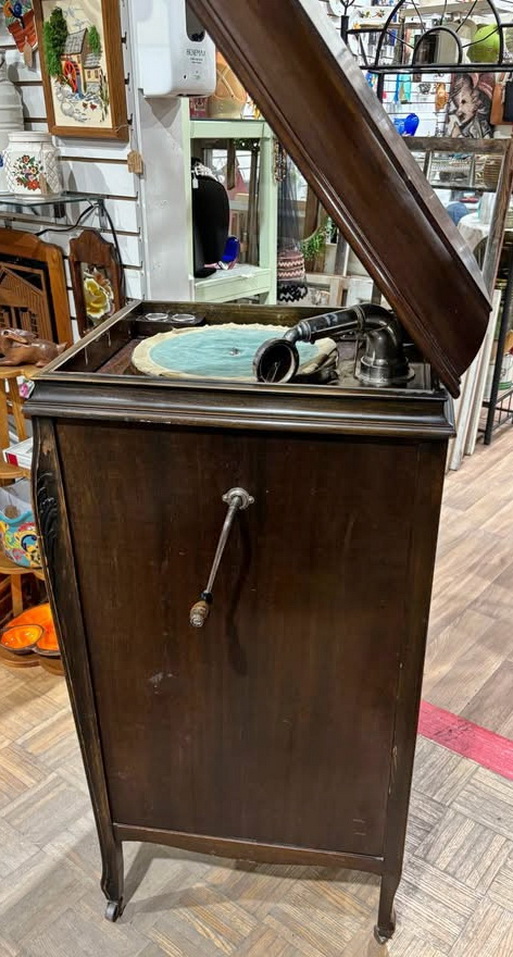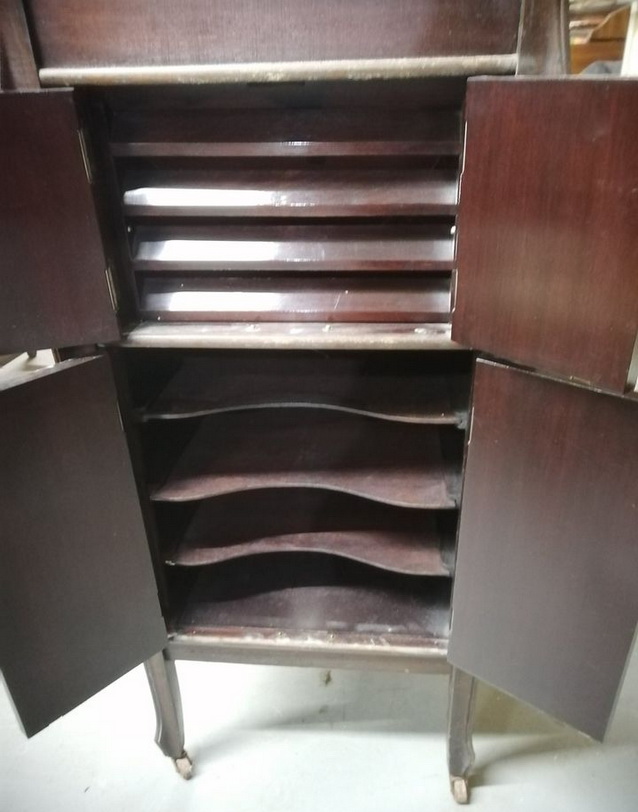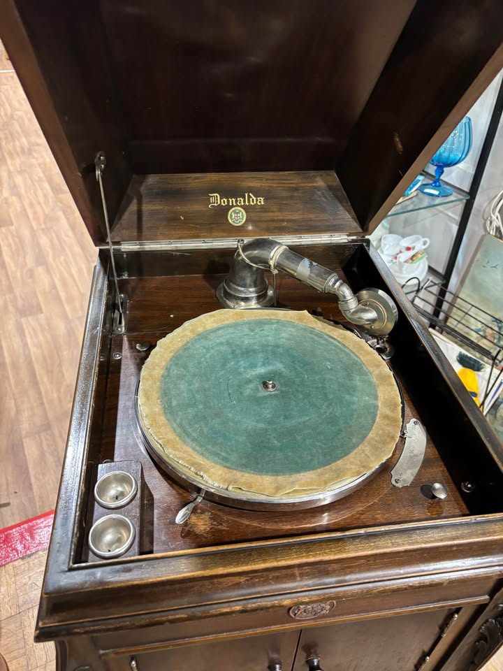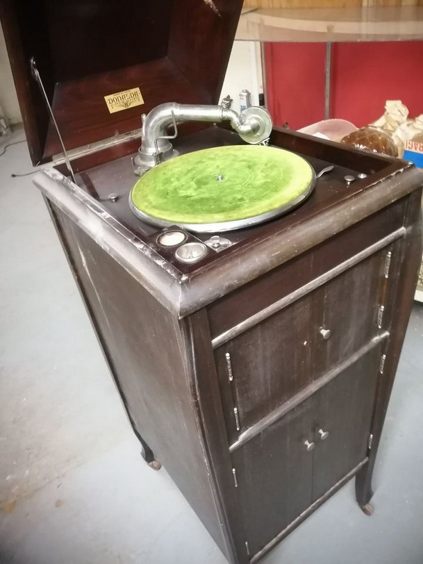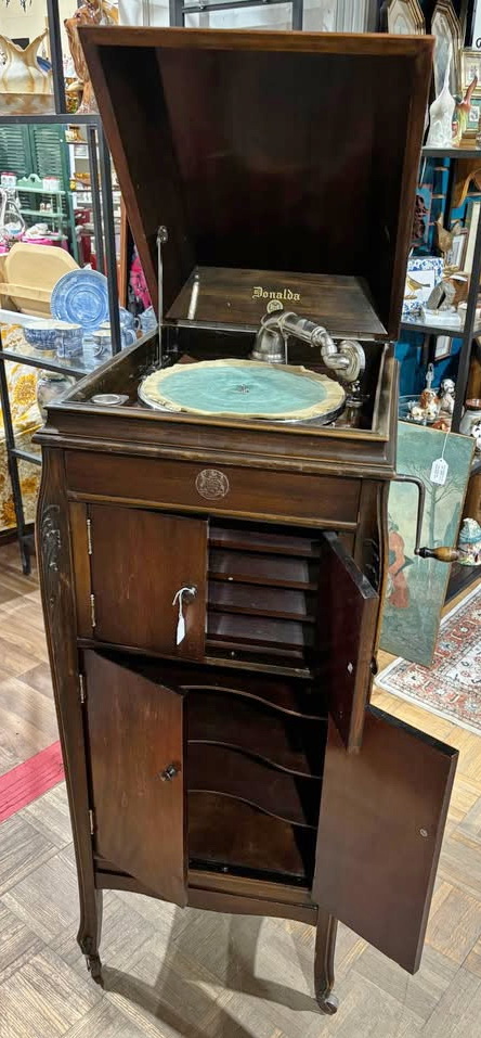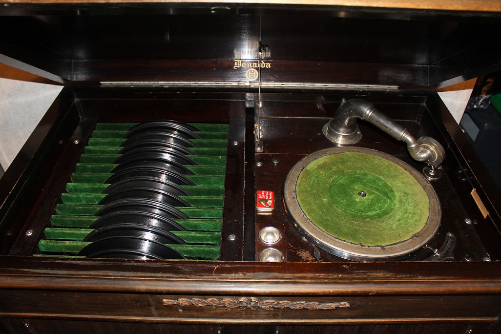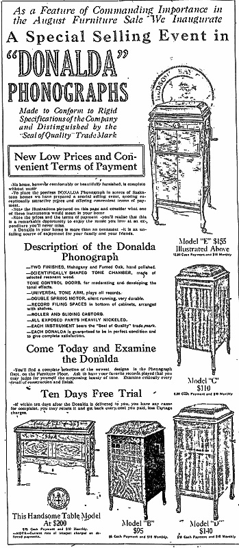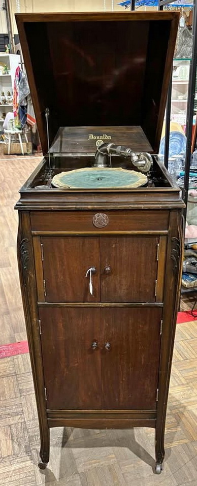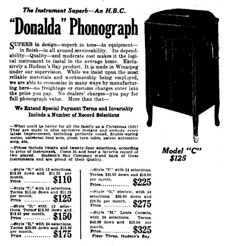 The email received that started this page: My mother bought a cabinet gramophone, around 50 years ago, from a Salvation Army Store in Winnipeg, Manitoba,. It stands on legs, has storage for records on the left side and a drawer on the bottom. It is marked with the Hudson Bay Company Logo on the inside, and also a Donalda logo as well. Lynn Houde Pictures of Lynn's console Donalda: