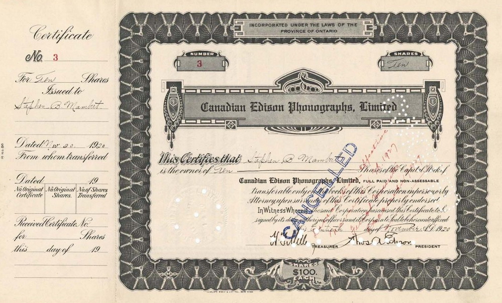 Canadian Edison Phonographs, Limited - Stock Certificate No. 3, dated Nov. 20, 1920, signed by Thomas Edison.