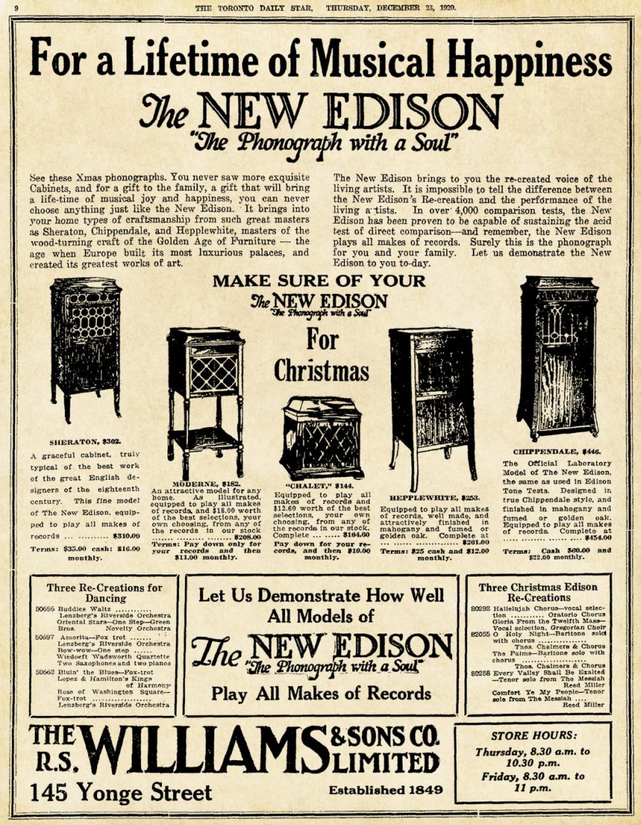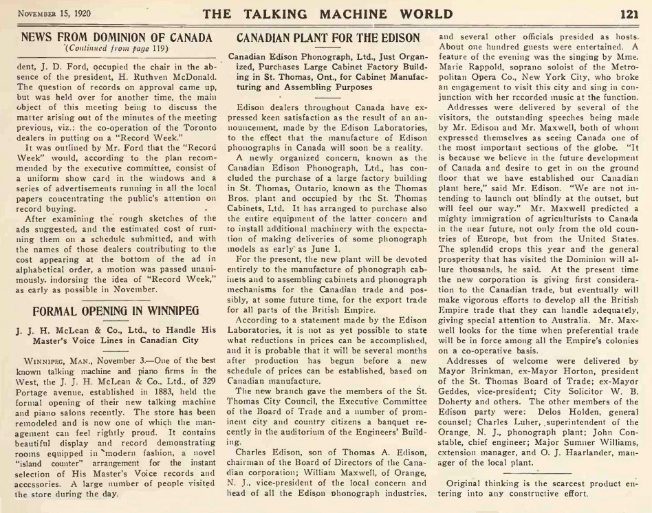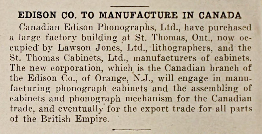 Talking Machine World, November 15, 1920, p. 121: "CANADIAN PLANT FOR THE EDISON - Canadian Edison Phonograph, Ltd., Just Organized, Purchases Large Cabinet Factory Building in St. Thomas, Ont., for Cabinet Manufacturing and Assembling Purposes