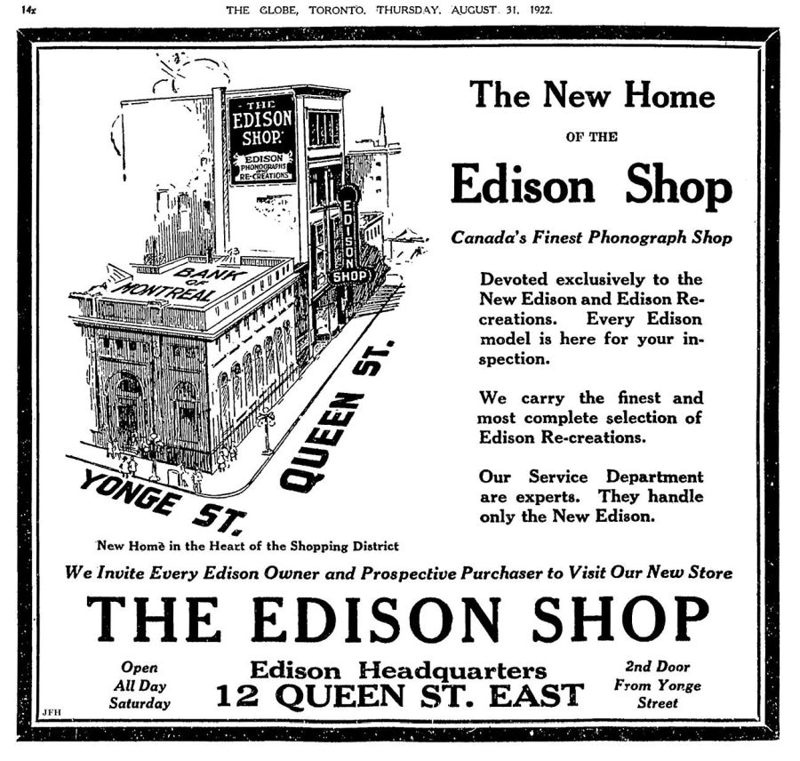The Globe, August 31, 1922, p. 14. This flagship store for Edison in Canada was eventually abandoned, but the painted wall sign for the Edison Shop remained on the building for several years after. Image digitally enhanced by