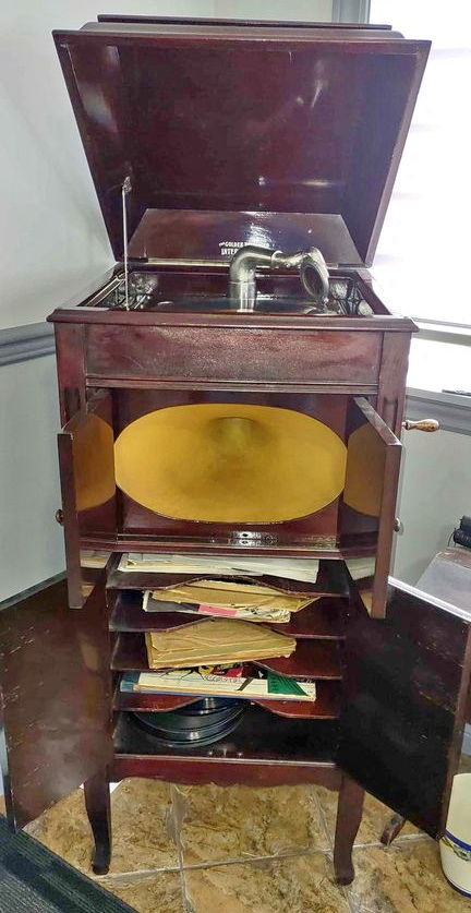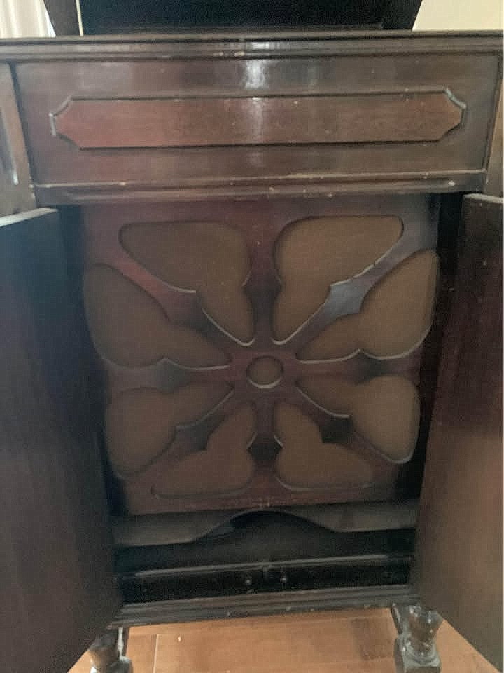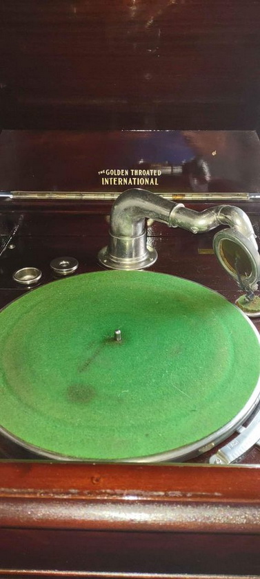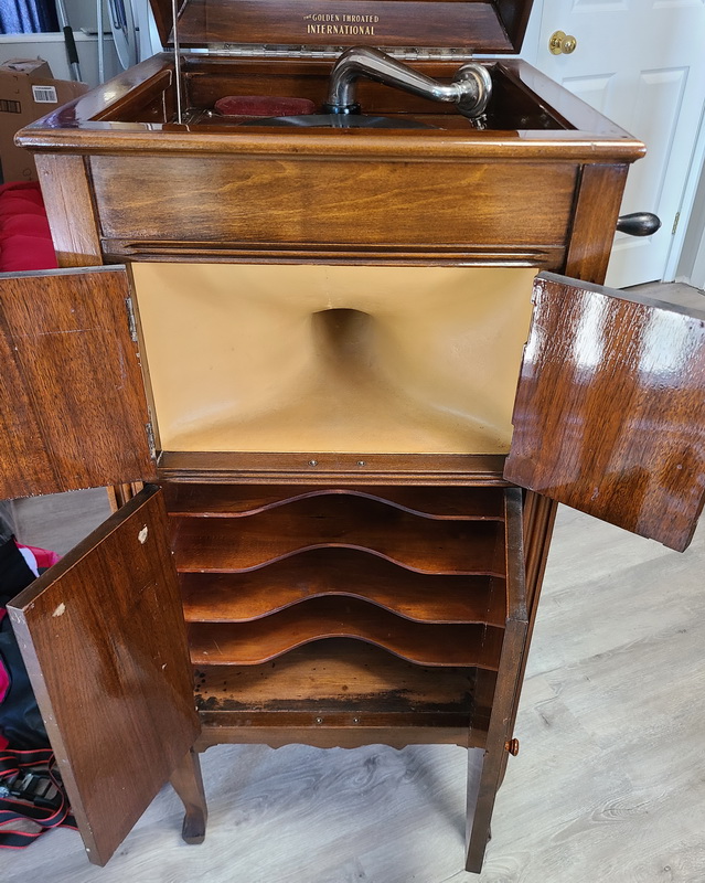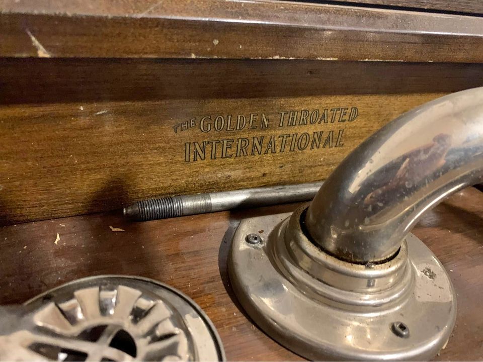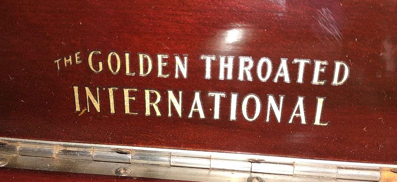 Beginning in 1926, the International Piano Company Limited, Listowel, Ontario sold the Golden Throated International phonograph through its agents, among which F.P. Partridge, 141 King Street West, Weston, Ontario and the Ontario Piano and Music Company Limited, 312 Bank Street, Ottawa, Ontario. The manufacturer of the phonograph is unknown although it may well have been a company such as The George McLagan Furniture Co., Limited, Stratford, Ontario or W.H. Banfield and Sons Ltd., Toronto, Ontario. Some Golden Throated International phonographs were equipped with an Alethophonic soundbox and tonearm which was manufactured by W.H. Banfield and Sons Ltd. (see Stewart page.) Through all of the advertising for the upright model of this phonograph, a single line art illustration was used. The illustration shows an ornamental applique on the front of the cabinet above the horn opening while the actual phonograph (see photographs below) is missing this decoration.