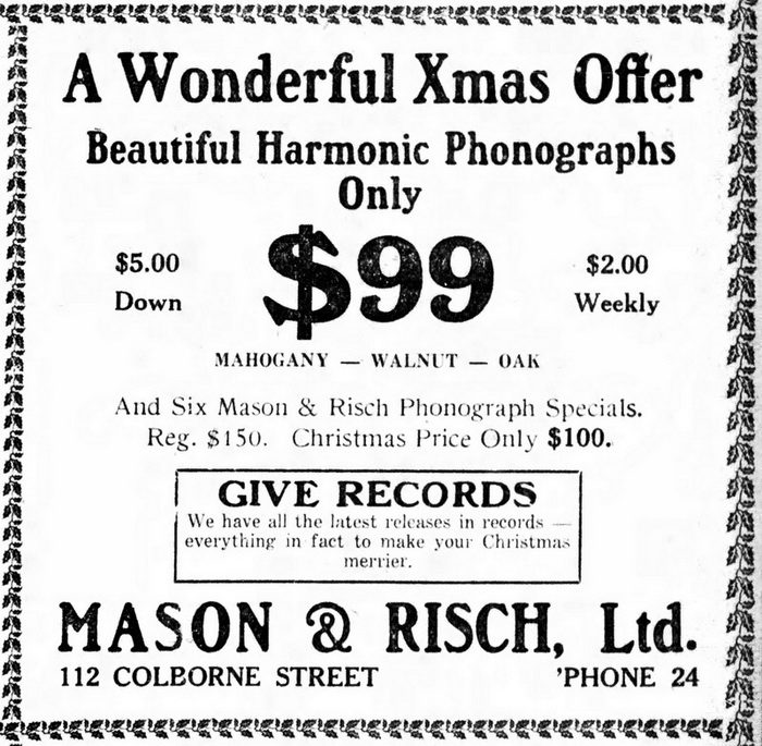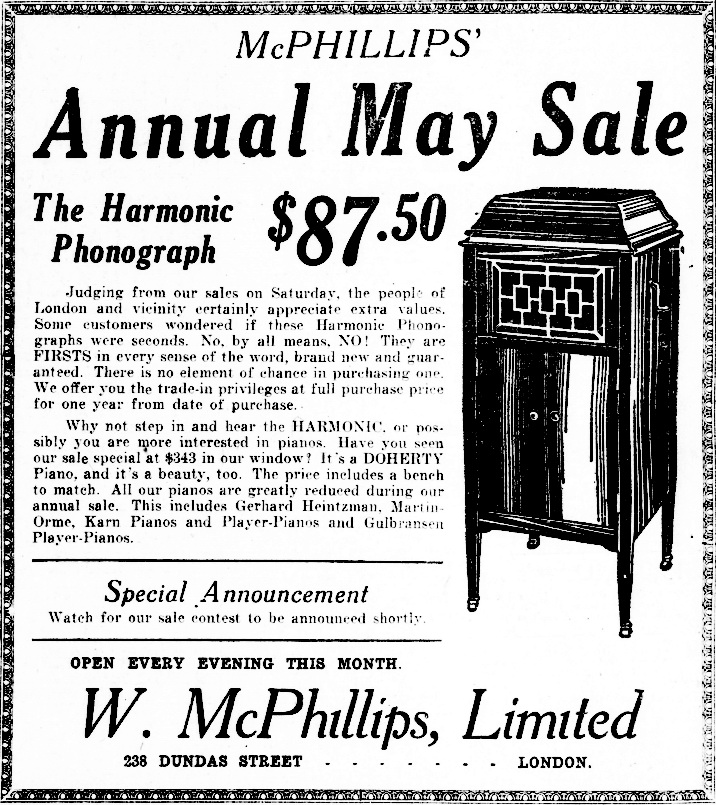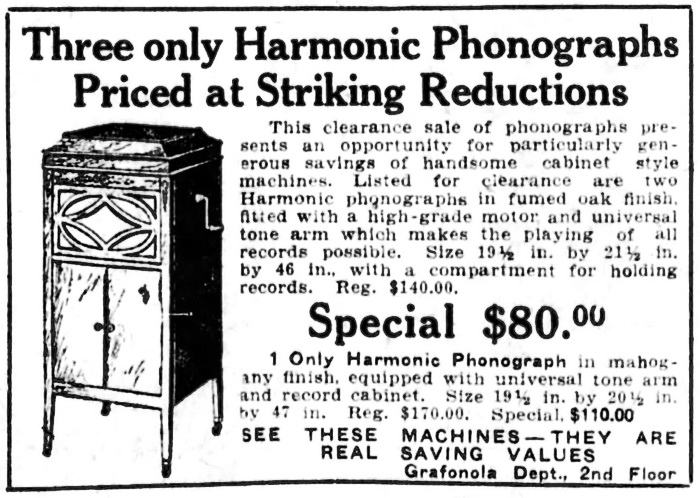 A Harmonic (Toronto) console phonograph found in September 2022 sold by Mason & Risch. Another Harmonic (Toronto) console phonograph listed in 2024 in North Perth, Ontario.