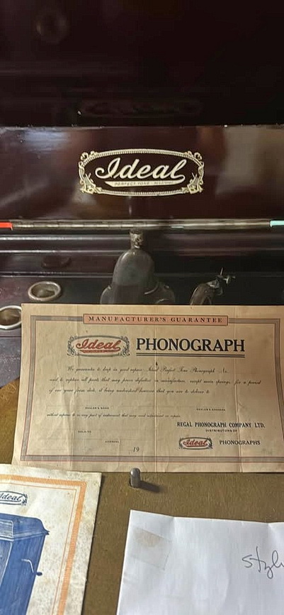 An Ideal phonograph listed in Fort Erie, Ontario in 2025 with the original guarantee from Regal Phonograph Company Ltd., Toronto.