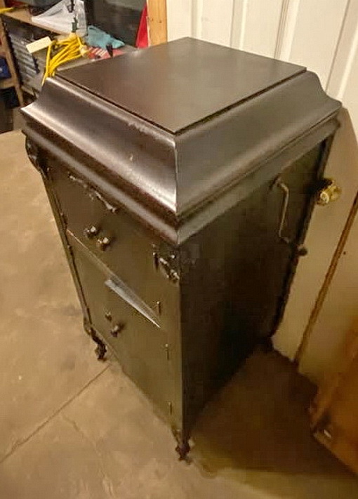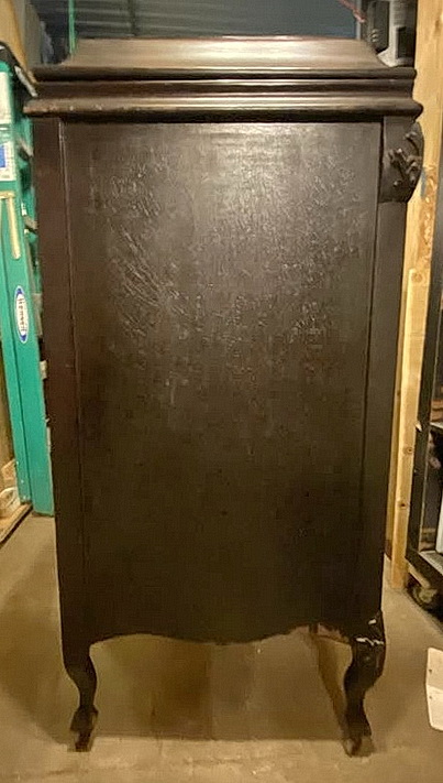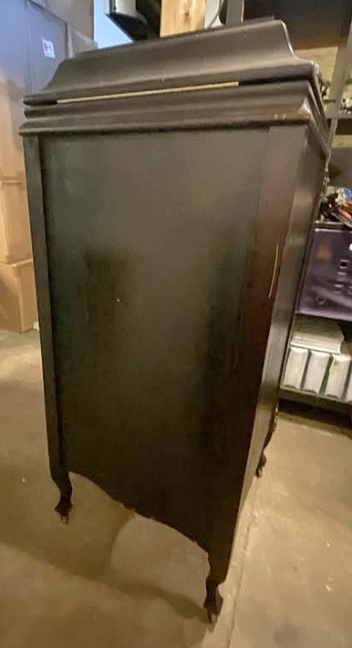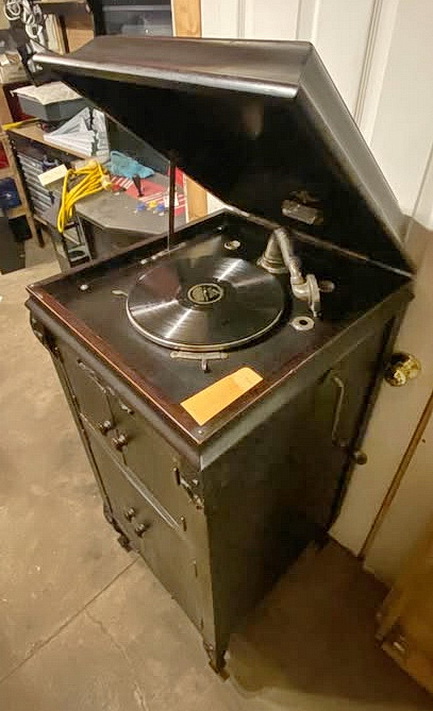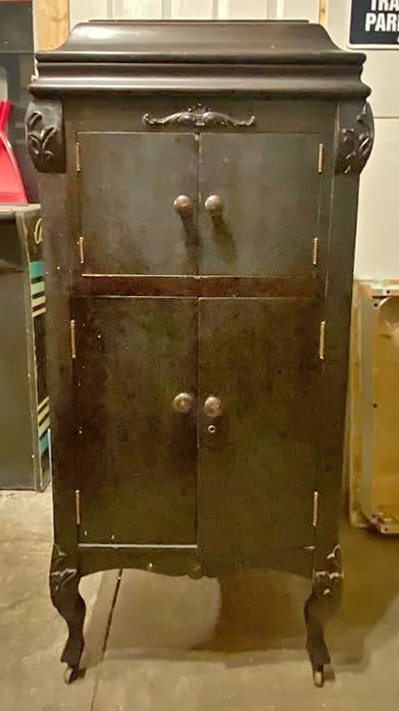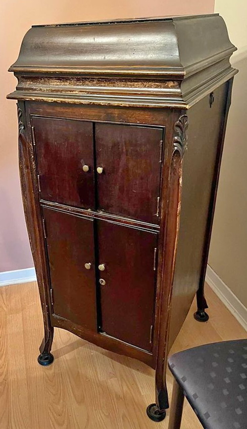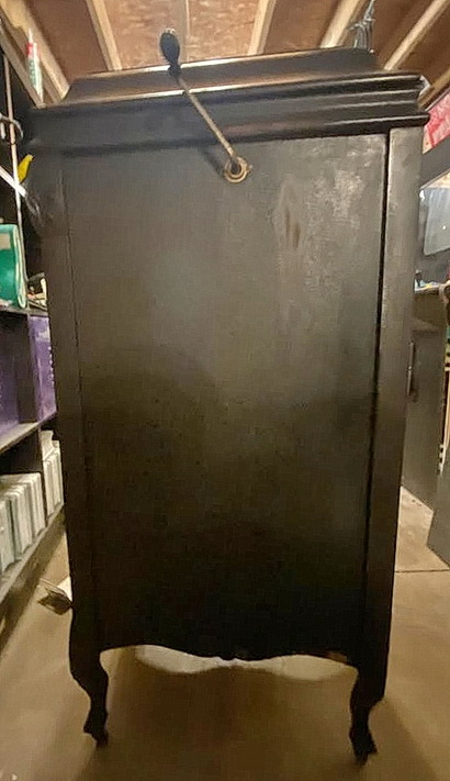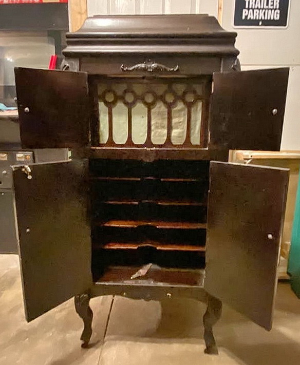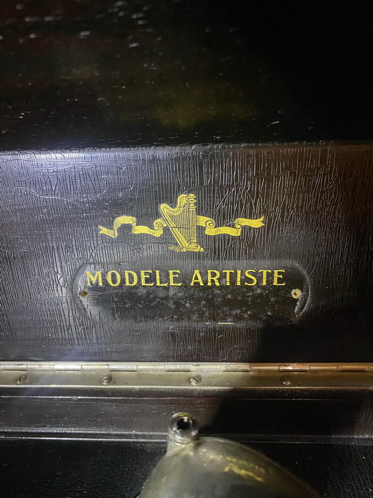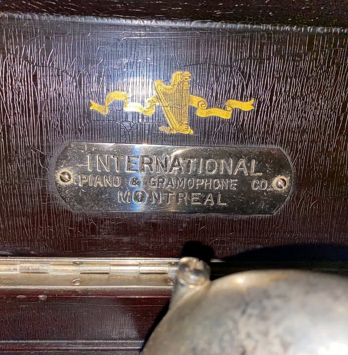 An upright model for sale through Facebook Marketplace in 2025 in Brantford, Ontario. Beneath the International Piano & Gramophone Co. tag, the cabinet is labelled "Modele Artiste". The door hardware idicates U.S. manufacture which was not uncommon at the time. The cabinet was constructed in Canada and the hardware, including the motor, was often imported from the U.S. The phonograph was assembled in Canada.