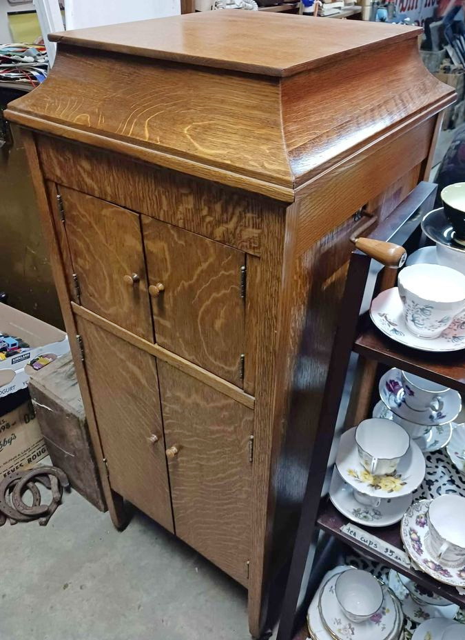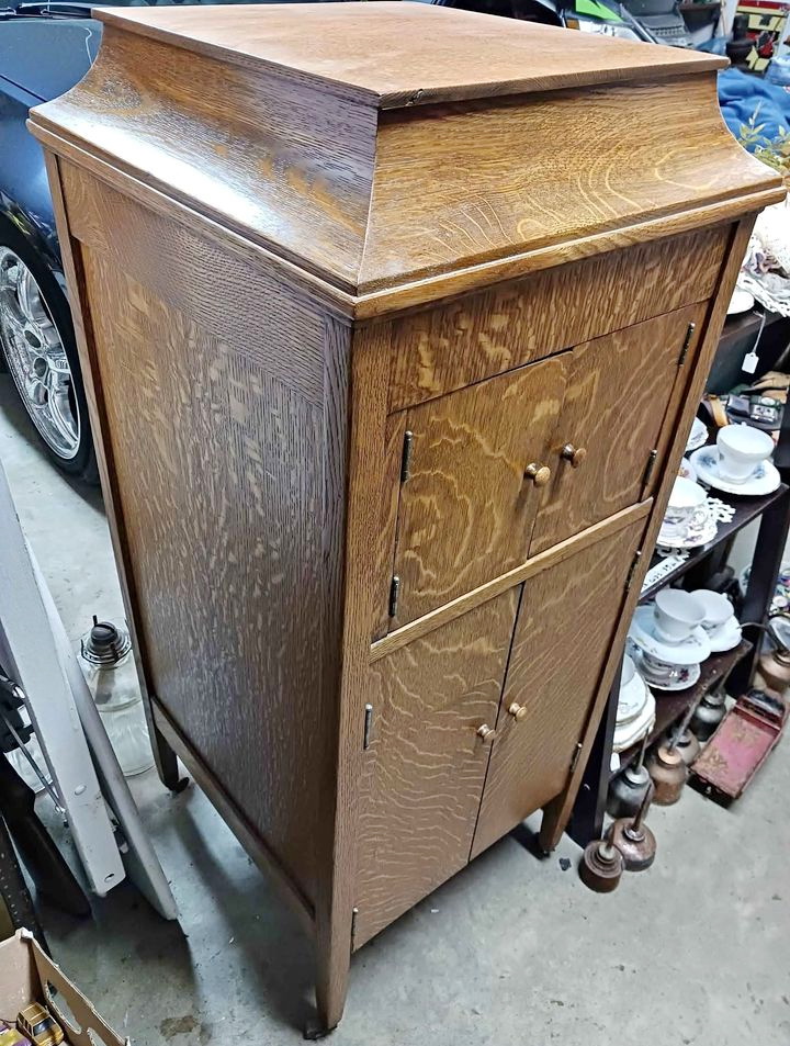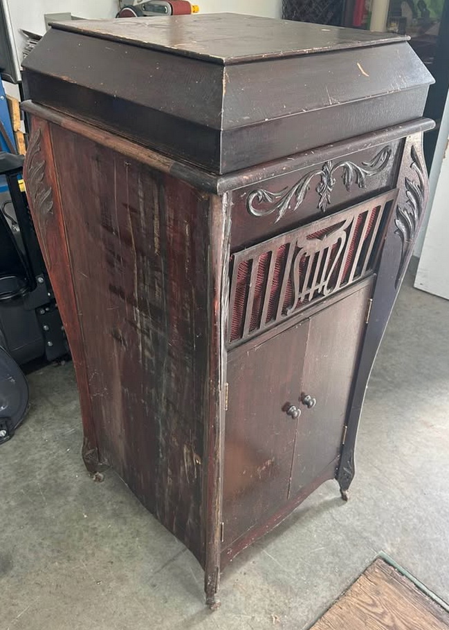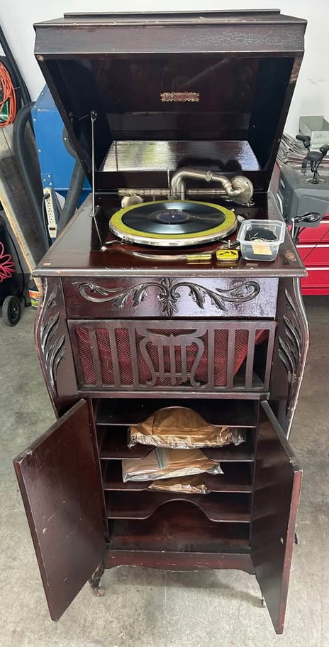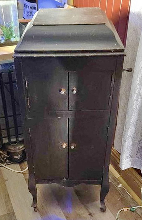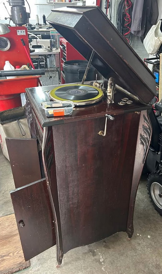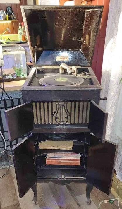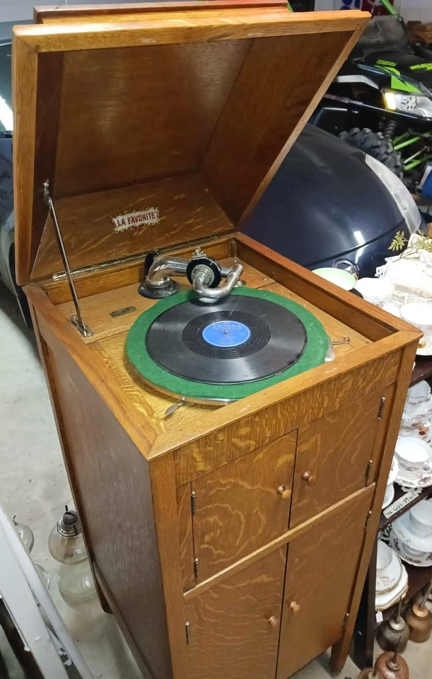 A traditional style La Favorite upright phonograph for sale at Ormstown, Quebec in 2023.