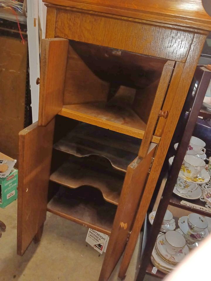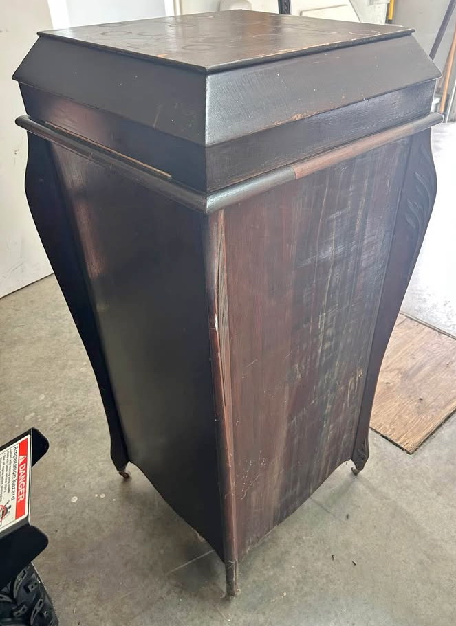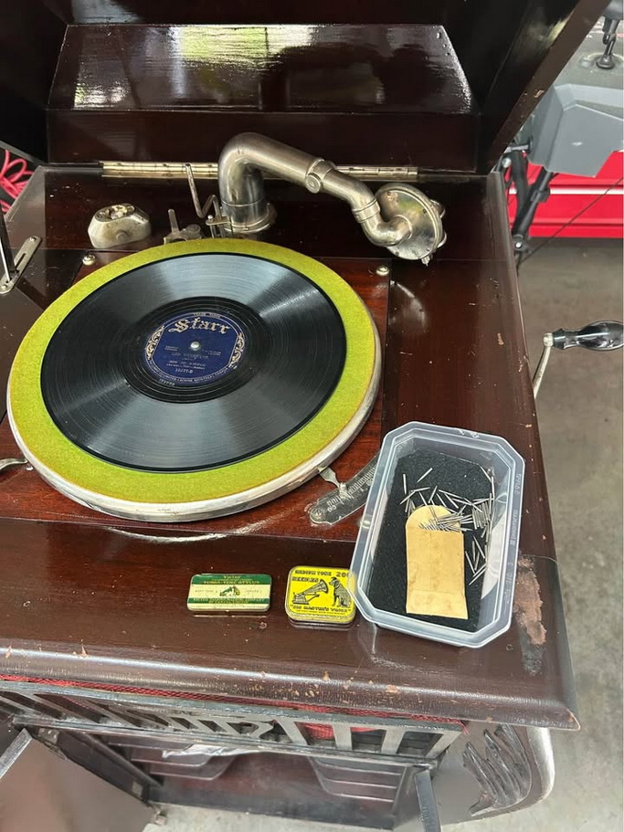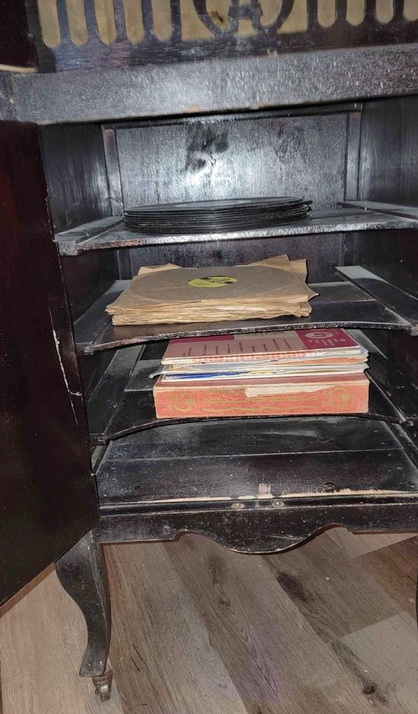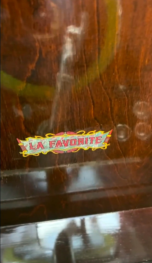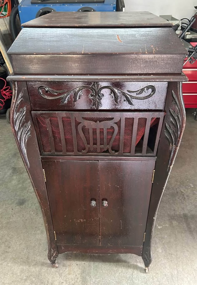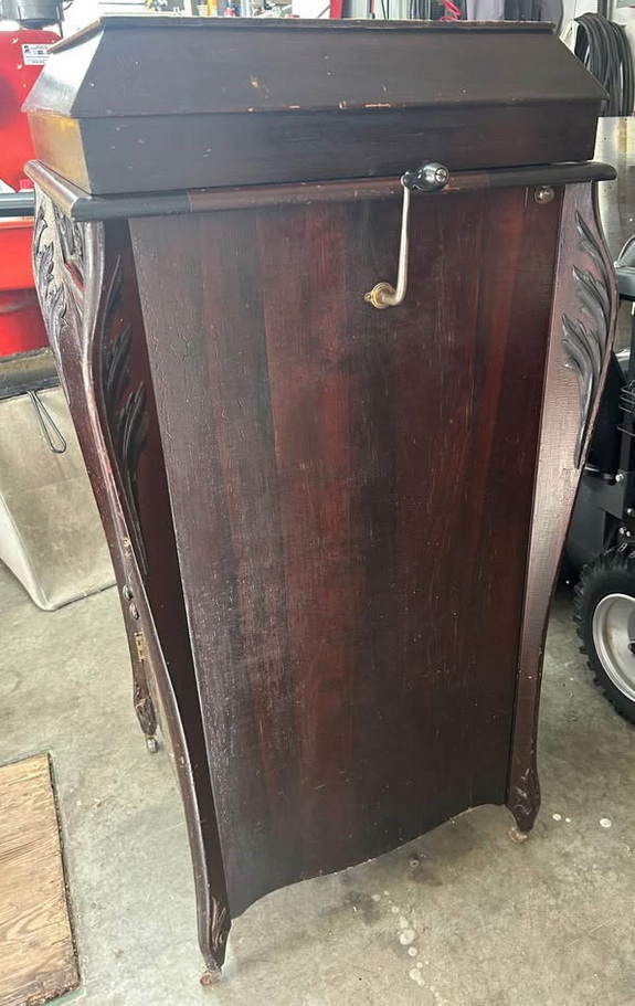 A traditional style La Favorite upright phonograph for sale at Ormstown, Quebec in 2023.