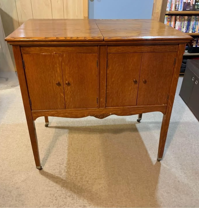 An oak console Lindsay phonograph labelled "Educator" for sale in Ottawa, Ontario in 2024.
