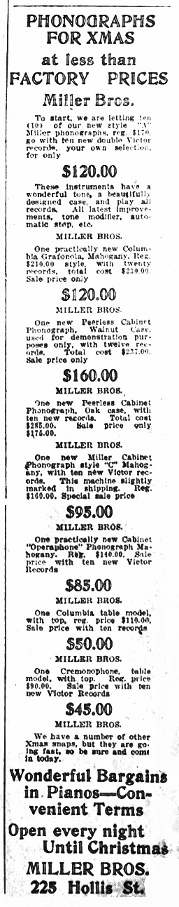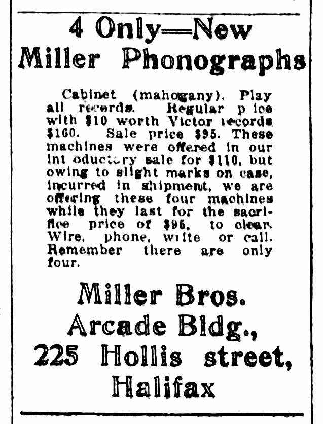 Halifax Evening Mail, December 20, 1921, p. 7. Ten new style "A" Miller phonographs and one style "C" phonograph.