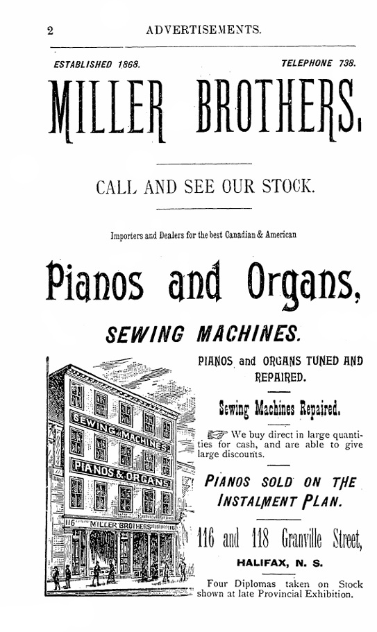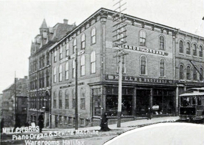 Undated photograph of Miller Bros. piano, organ & sewing machine warerooms, Halifax, N.S.