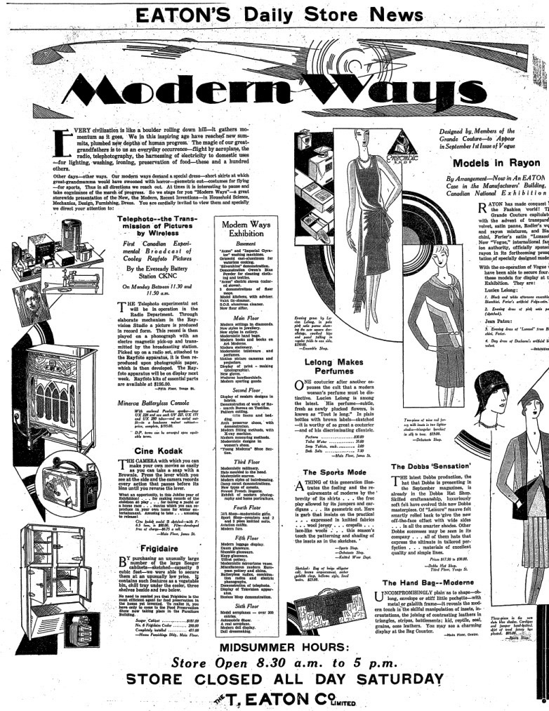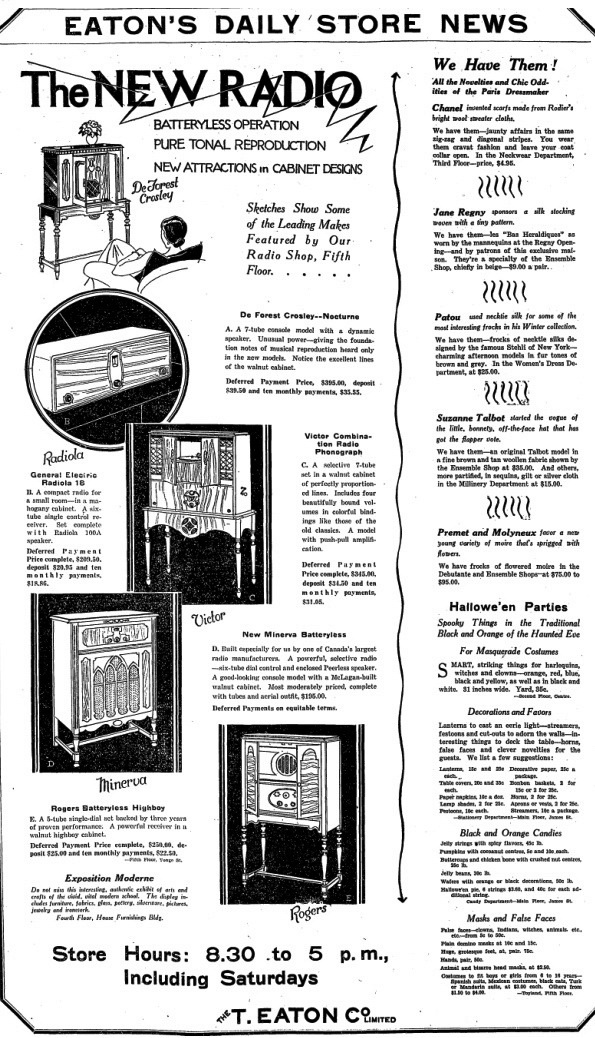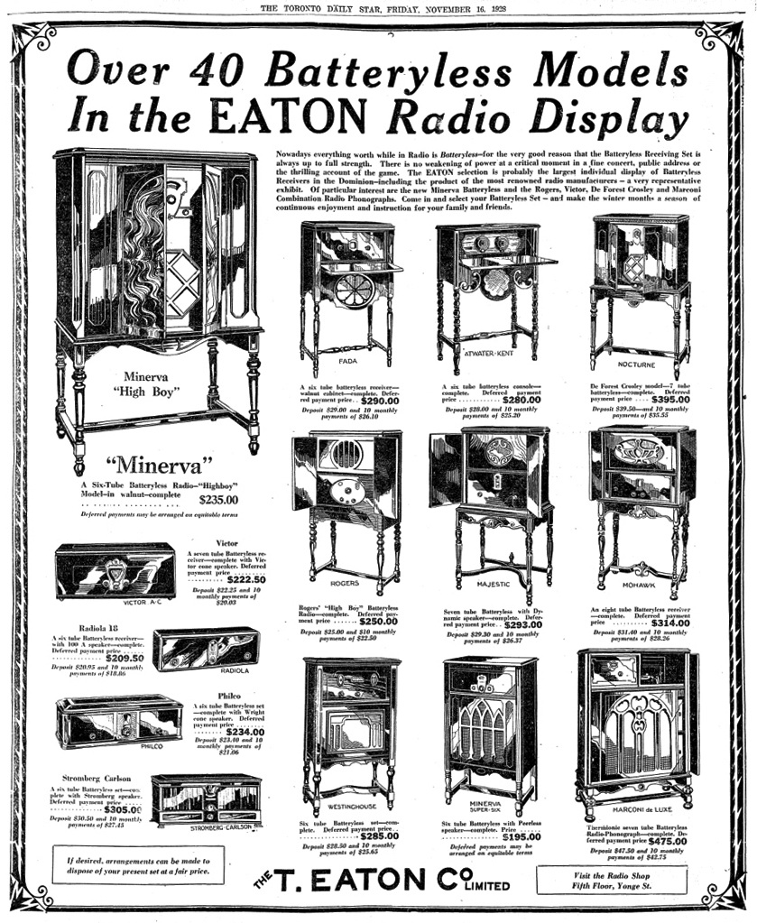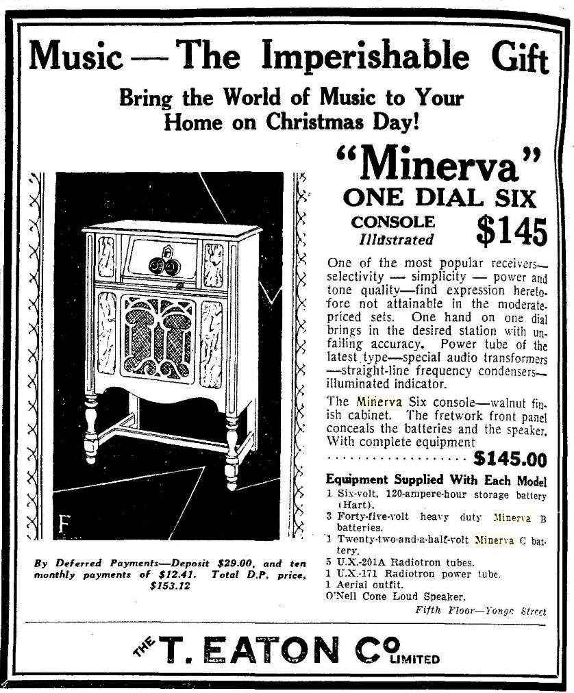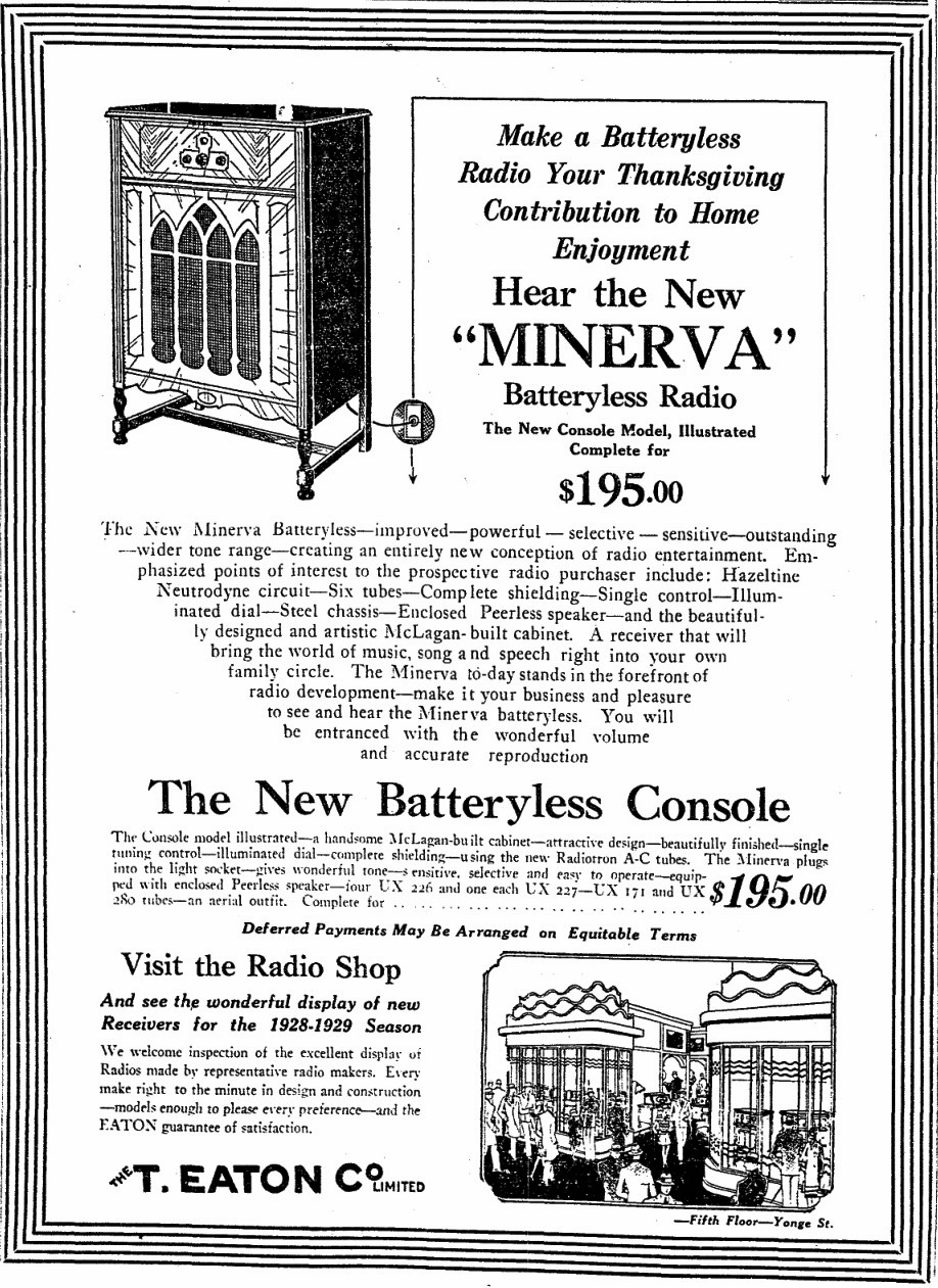 In 1927, the T. Eaton Co. Limited, Toronto, Ontario began selling the Minerva One Dial Six Console battery-operated radio. In 1928 Eaton's introduced the new Minerva console-model batteryless radio built especially for that company "by one of Canada's largest radio manufacturers ... with a McLagan-built walnut cabinet."