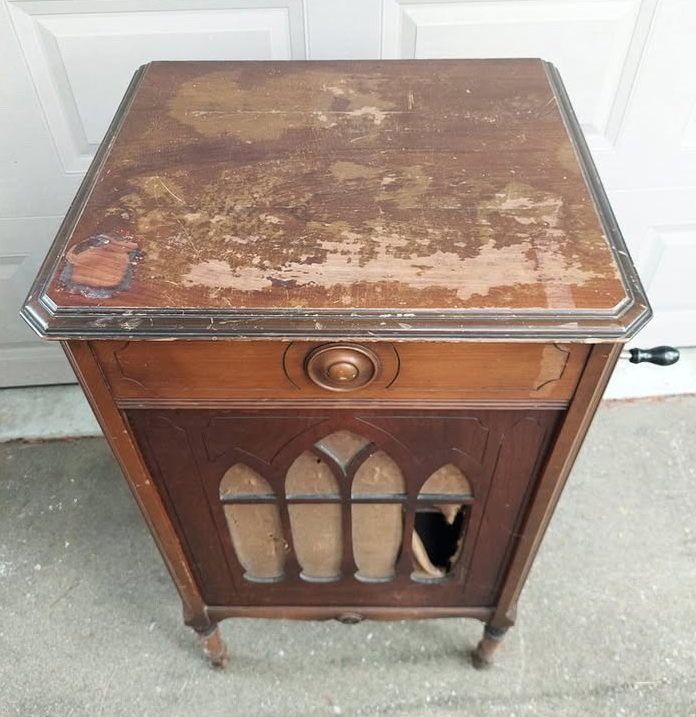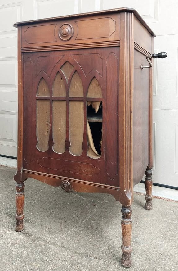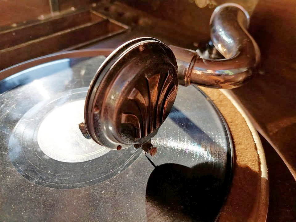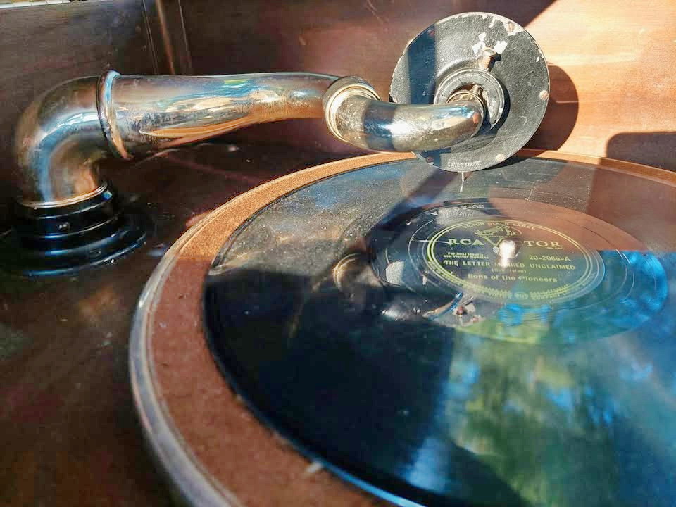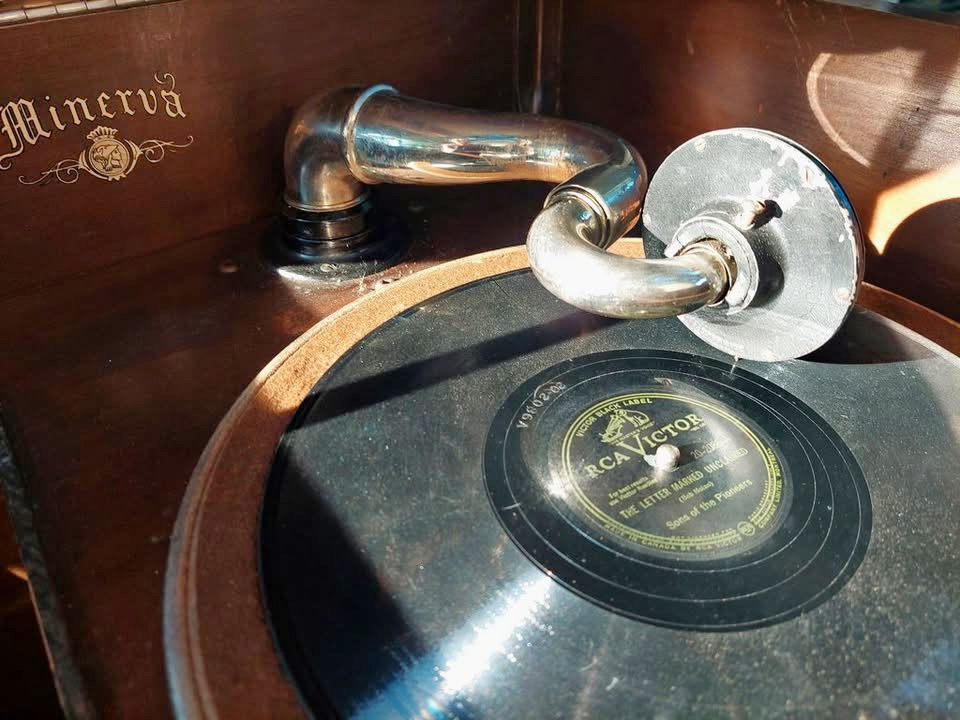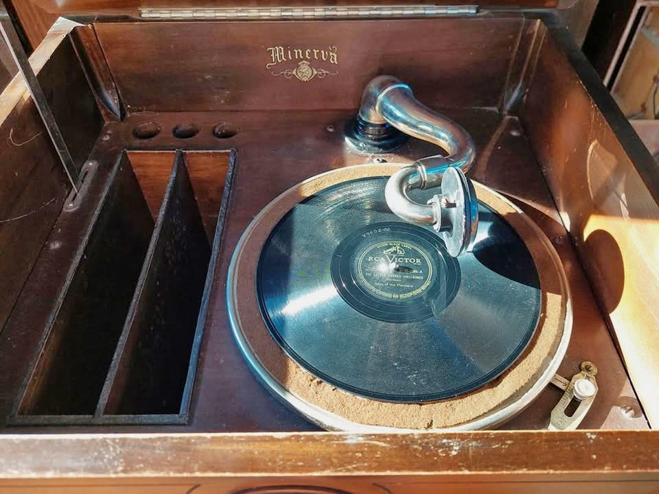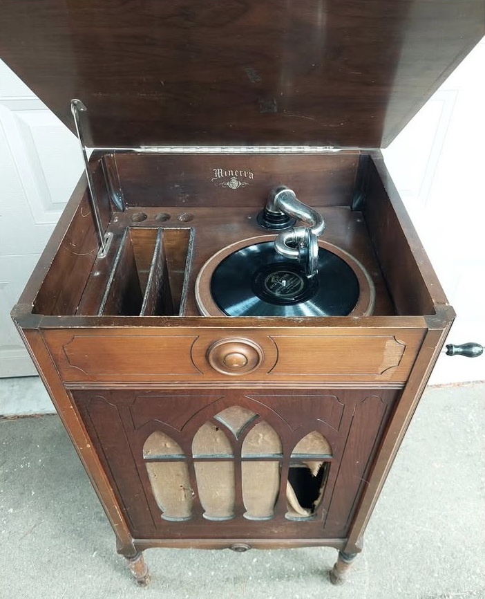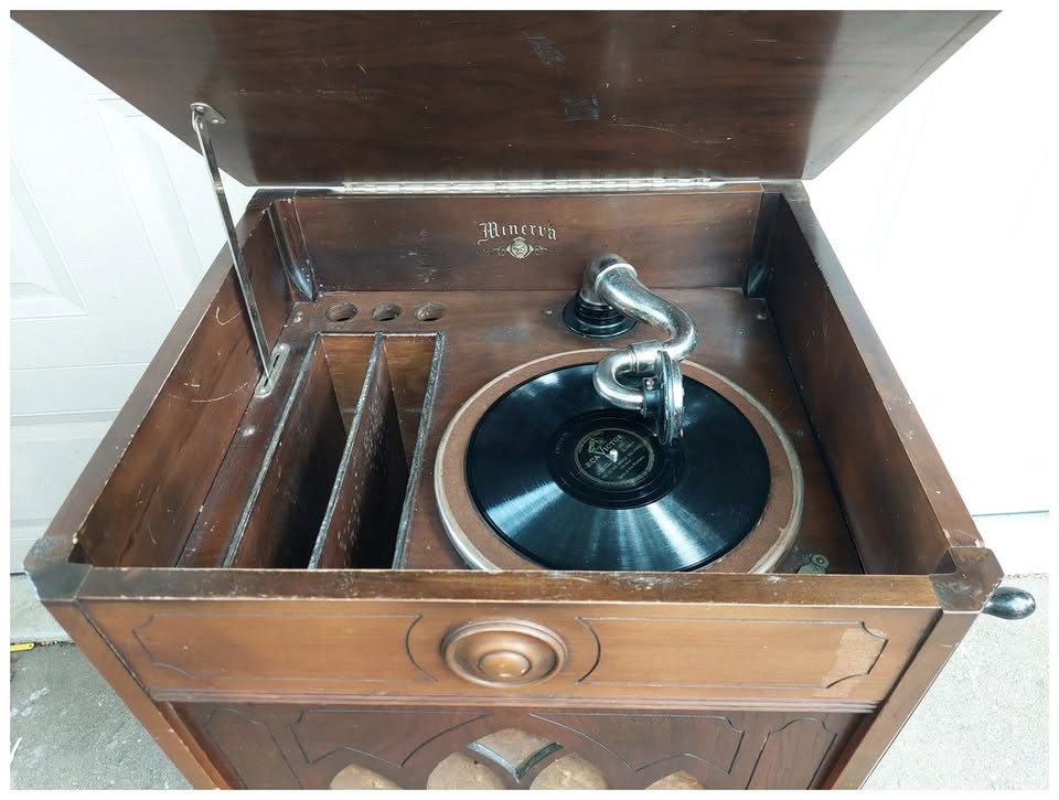 An Minerva-labelled phonograph listed through Facebook Marketplace in 2024 in Kitchener, Ontario.