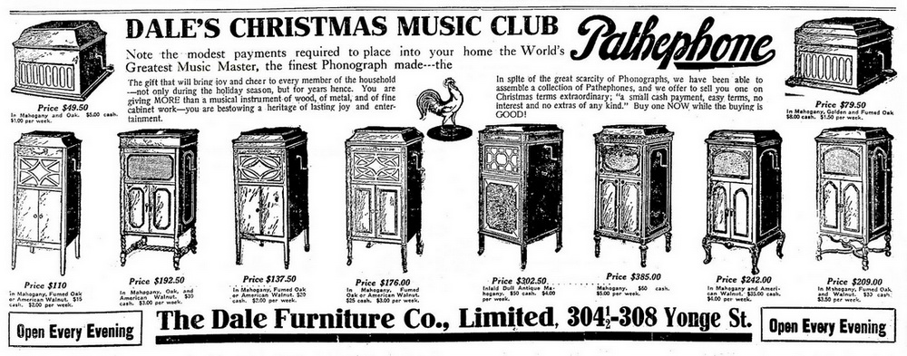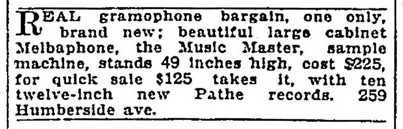 And in 1920, another ad described a "Real gramophone bargain, one only, brand new, beautiful large cabinet Melbaphone, the Music Master, cost $225, for quick sale $125." (Toronto Daily Star, March 24, 1920, p. 20).