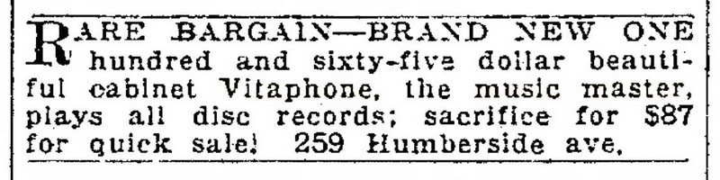 In 1919, a classified ad in the Toronto Daily Star, March 22, 1919, p. 21 offered a "Rare bargain, brand new one hundred and sixty-five dollar beautiful cabinet Vitaphone, the Music Master, plays all disc records, sacrifice for $87 for quick sale".