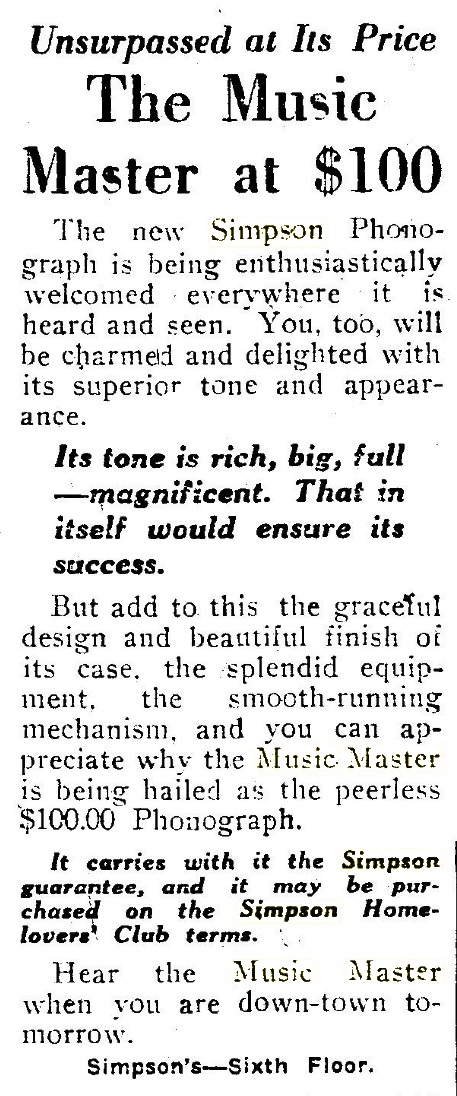 TDS June 24, 1929 p. 14, yet another new model with an introductory sale price of only $59.00. This was the last Simpson's display ad for the Music Master phonograph.
