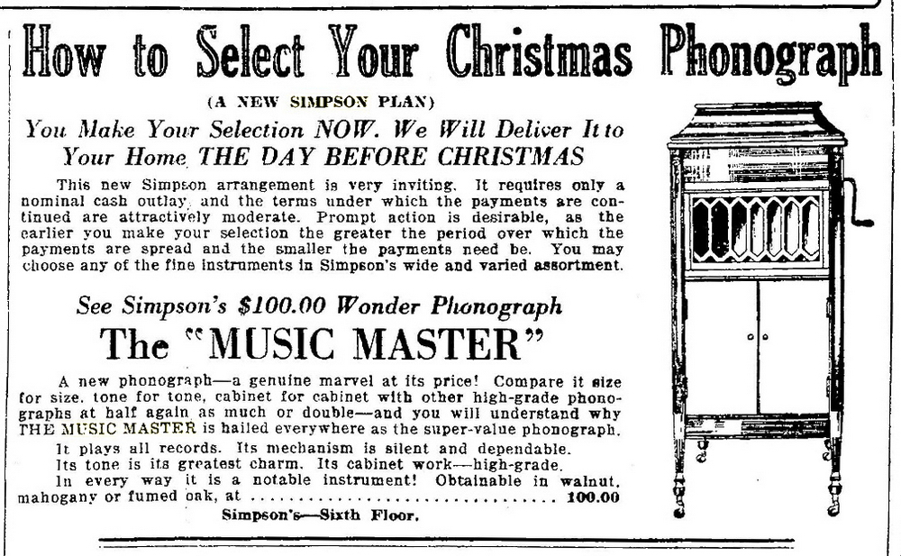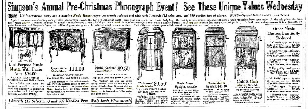 TDS November 18, 1924 p. 15, Simpson's annual pre-Christmas sale, 116 instruments including upright, tabletop, console and electric models.