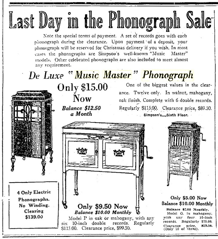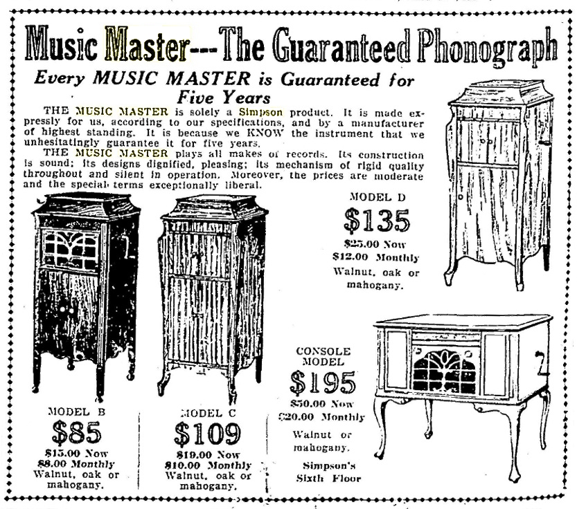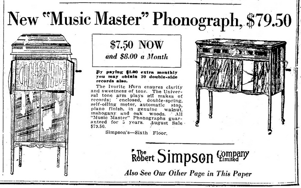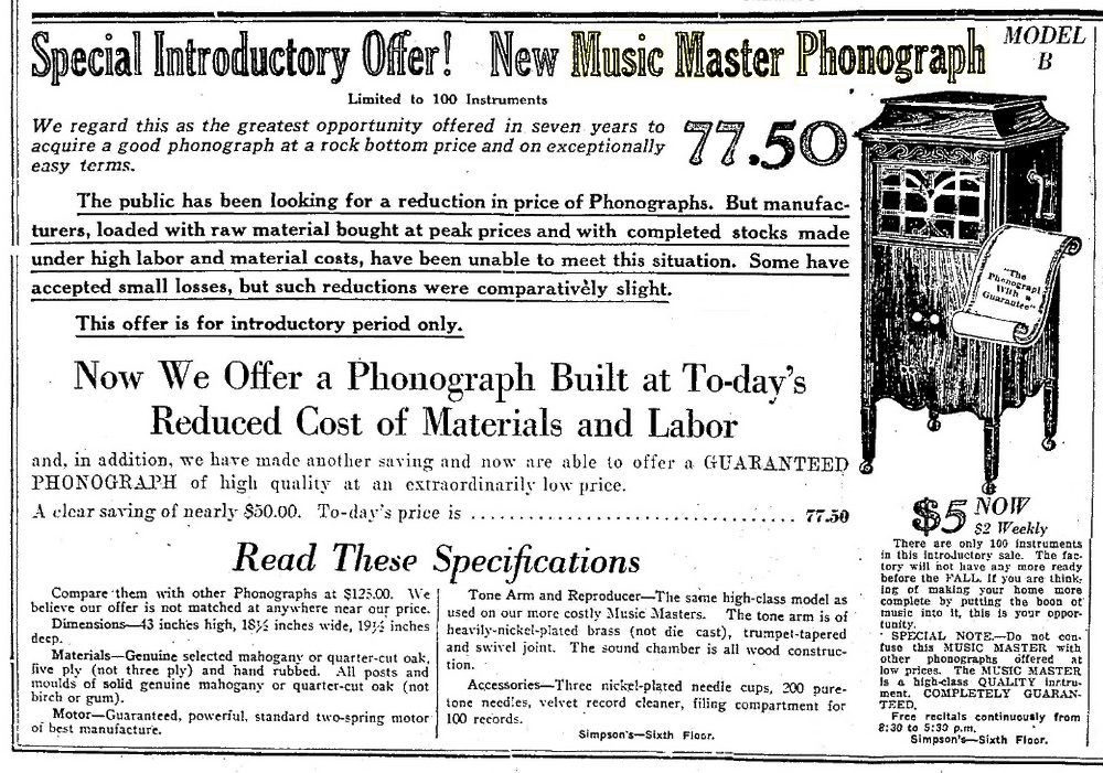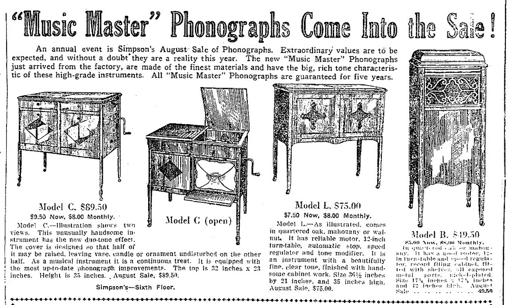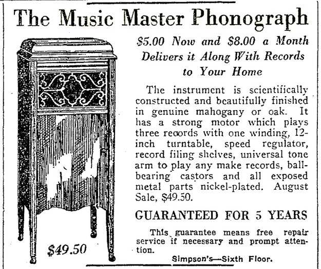TDS July 18, 1923 p. 15, Simpson's summer sale of Music Master phonographs.