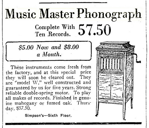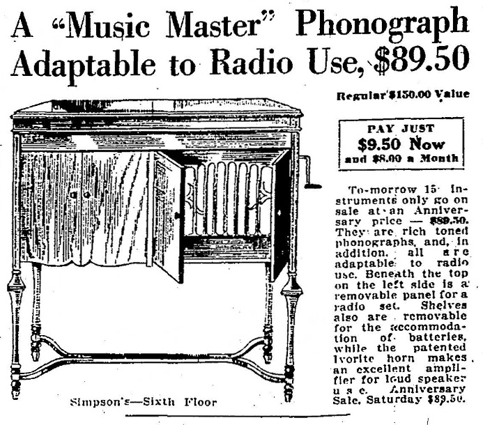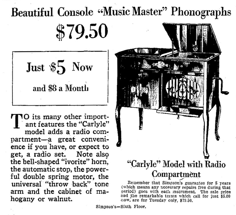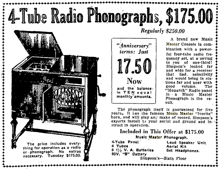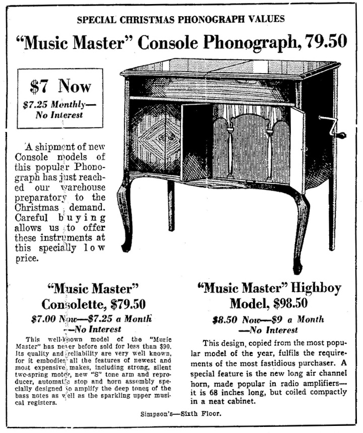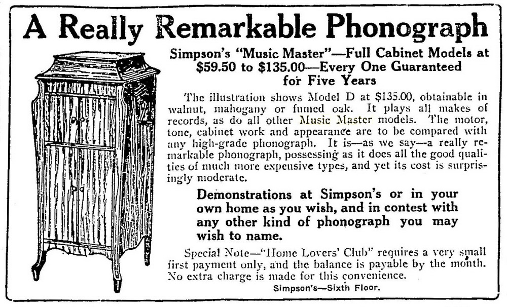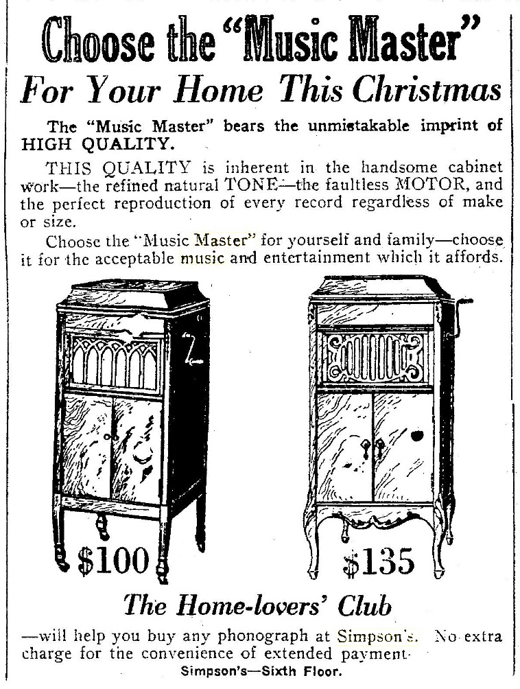 TDS July 18, 1923 p. 15, Simpson's summer sale of Music Master phonographs.