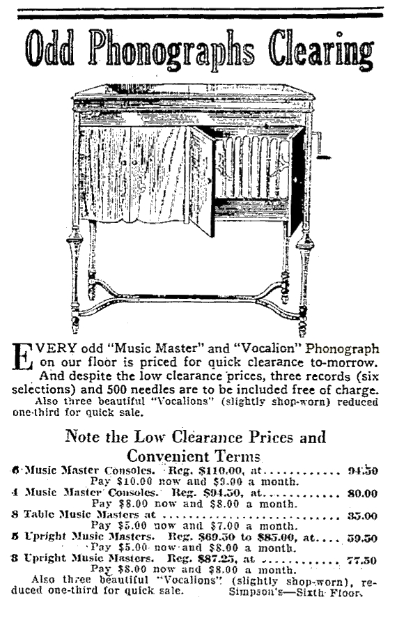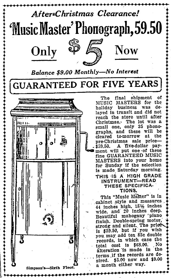 TDS January 26, 1925 p. 14, clearance of upright, console and tabletop Music Master phonographs.