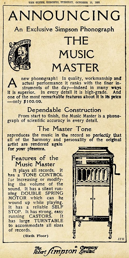 The first display ad in The Globe dated October 12, 1920 p. 3 introducing the new Simpson phonograph, the Music Master. Image digitally enhanced by Hopkin Design.