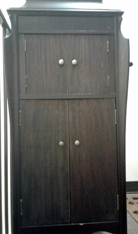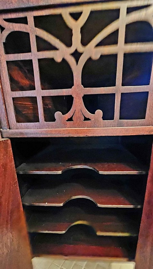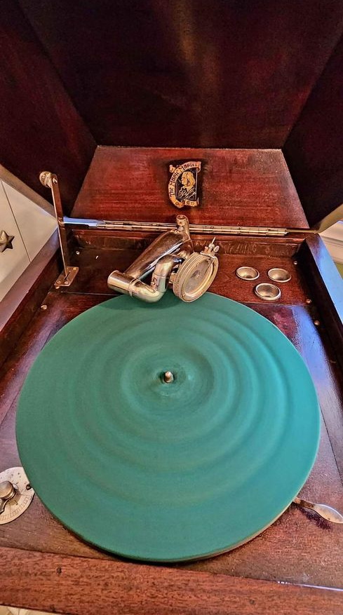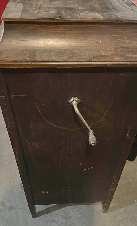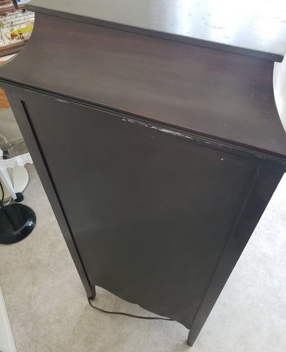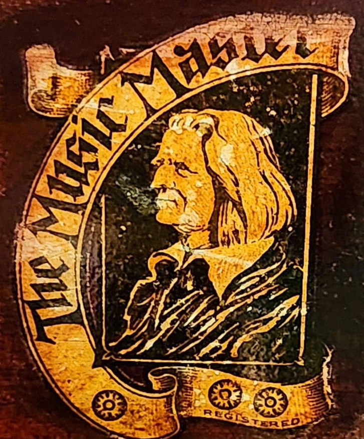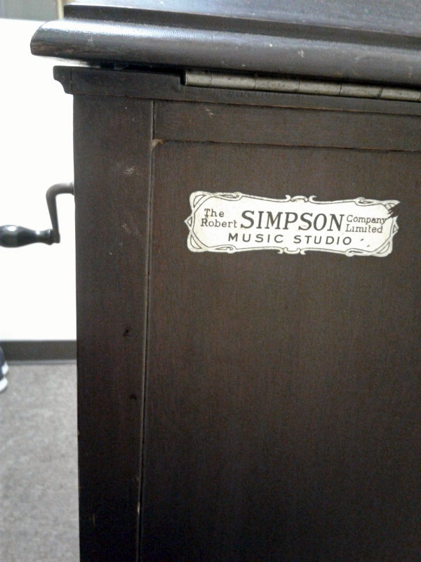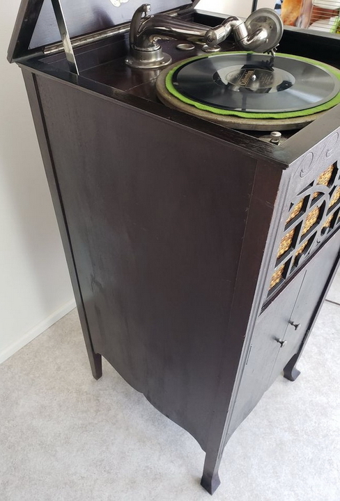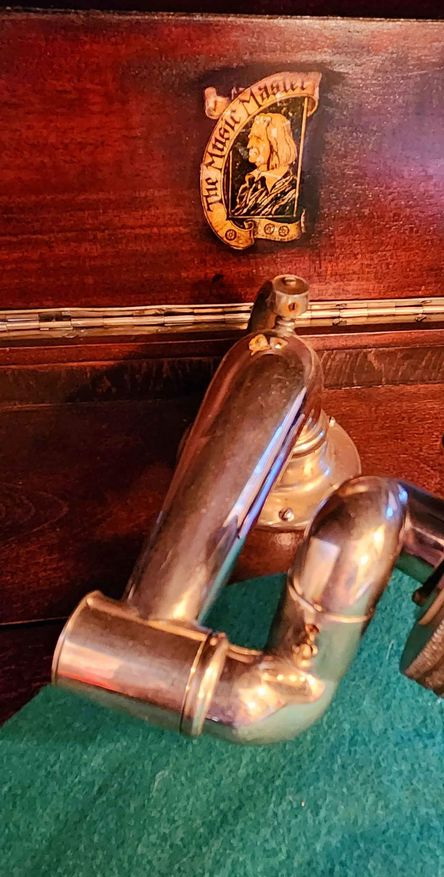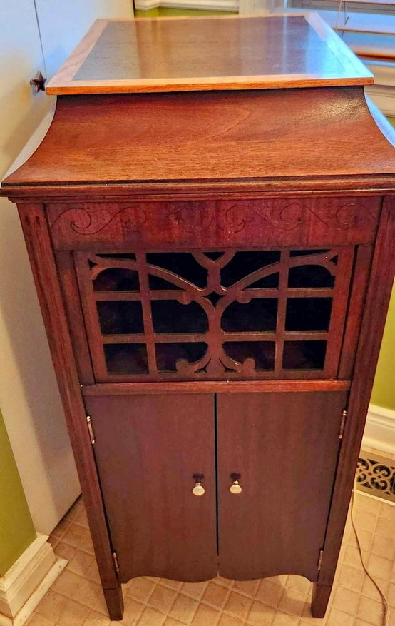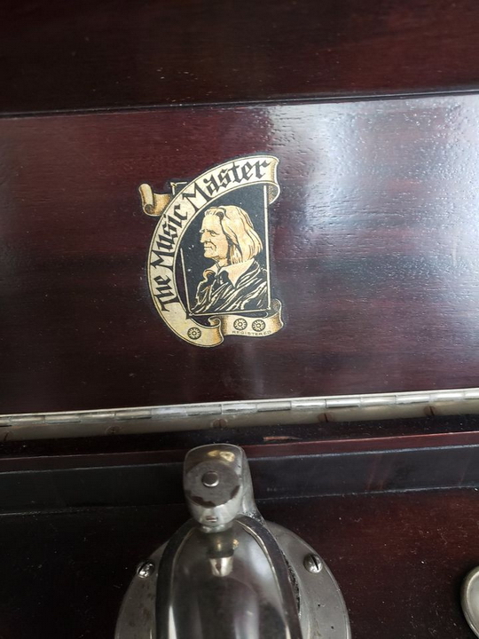 An upright cabinet Music Master in dark mahogany submitted by Norman Brooks in 2023. "The construction method and design of the cabinets looks very much to me like they may have been made by Phonola...and of course the hardware is very Phonolaesque." (See the Phonola page - https://www.capsnews.org/capp/phonola/phonola.html - especially the display ads for 1918 and 1919.)